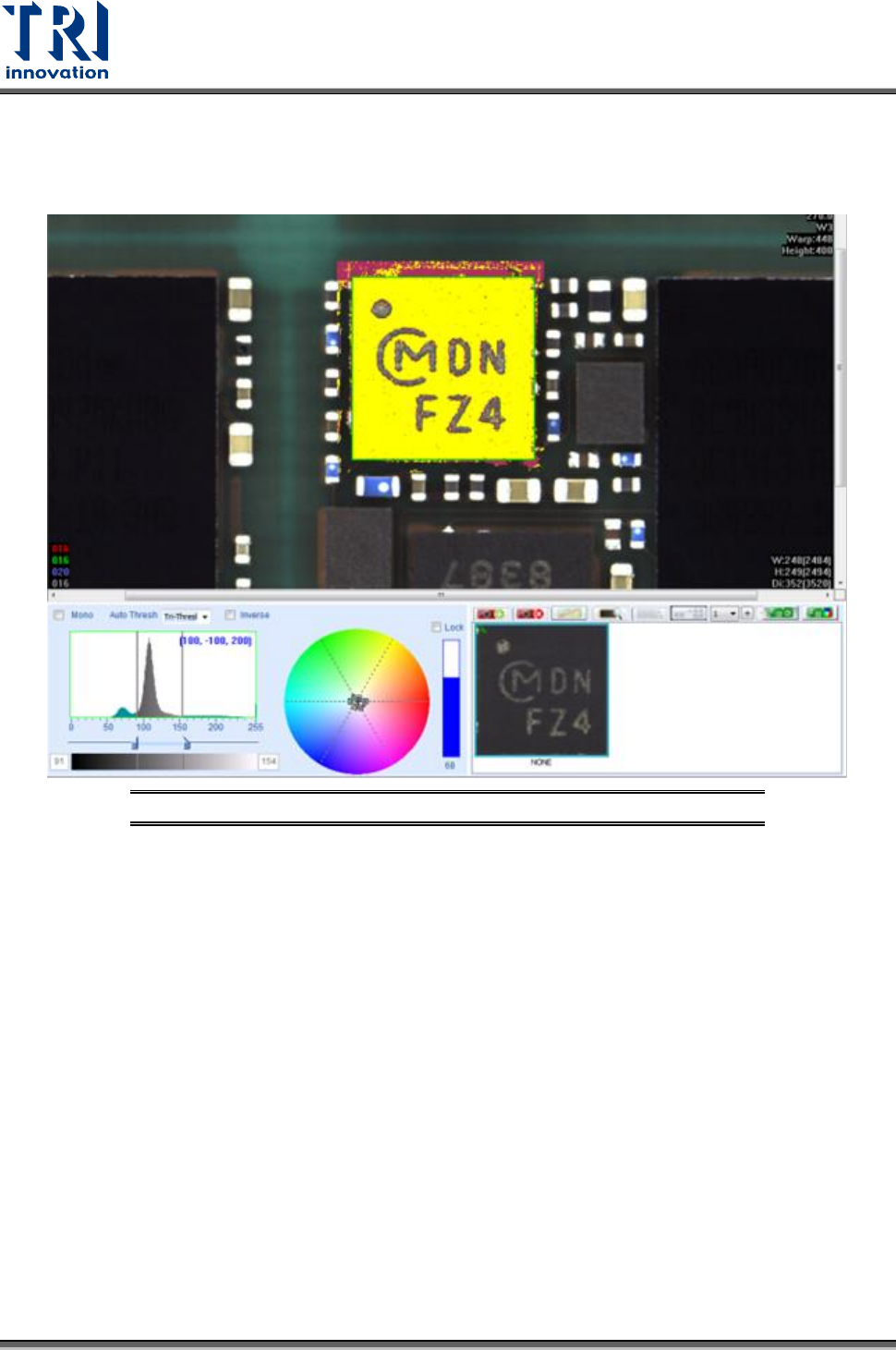 Test Research, Inc. 48 TR7500 SIII Series User G uide – Soft ware 此功能適用於當調整完 權重後,直方圖中僅有明顯 的三個群組,如元件文字、黑元件 本體以及底板背景。使 用後系統會自動設定門檻值 來區分這三部分並找出元件本體位 置。 圖 64 :自動雙門 檻使用範例 2. 色彩空間法 (Color Space) : 此方法是利用選取顏色 與色彩強度來變更代料影像 ,其操作介…