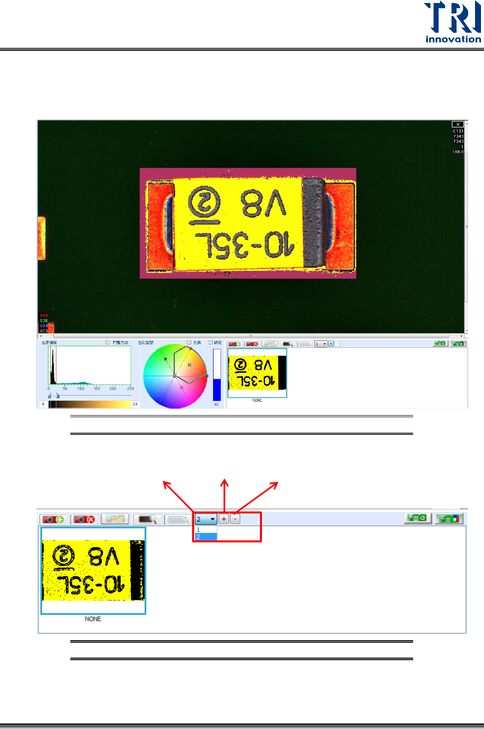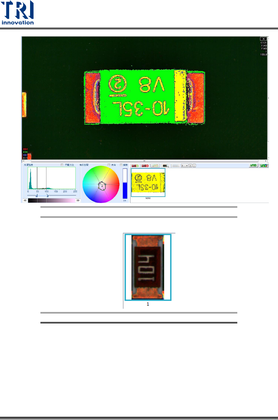 Test Research, Inc. 56 TR7500 SIII Series User G uide – Soft ware 圖 77 :選取第二區 色彩設定 原始影像:顯示未經過處 理的原始代料影像,如下 圖所示。 圖 78 :原始的代料 影像 處理後影像:顯示經過影 像處理後的代料影像,如 下圖所示。