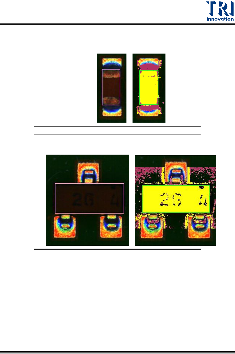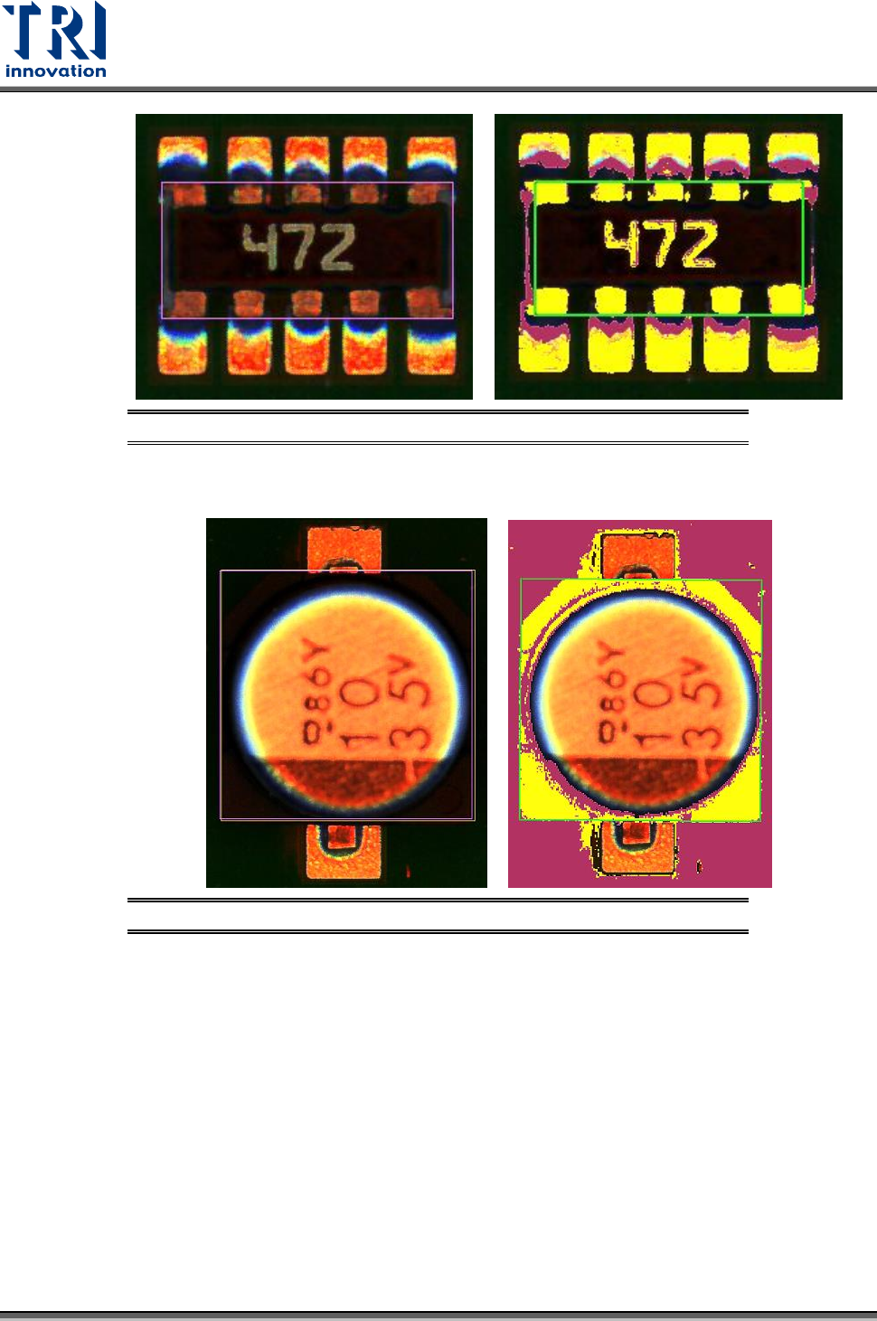 Test Research, Inc. 66 TR7500 SIII Series User G uide – Soft ware 圖 94 :本體檢測框 – Rnet 模 式色彩選取方式 - CAE :用來檢測鋁質電容。選色時 可以選擇使用鋁質電容的 底板顏色或者 是圓形電 容的部分,如下圖所示 。 圖 95 :本體檢測框 – CAE 模 式色彩選取方式 X 方向標準尺寸:設定檢 測元件在 X 方向的標準尺 寸。 Y 方向標準…