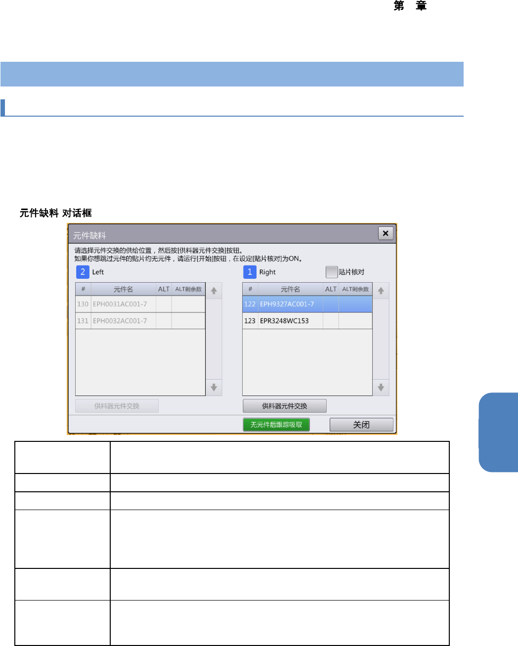 后调出元件交换对话框,以开始对发生无元件的供给部进行元件交换。