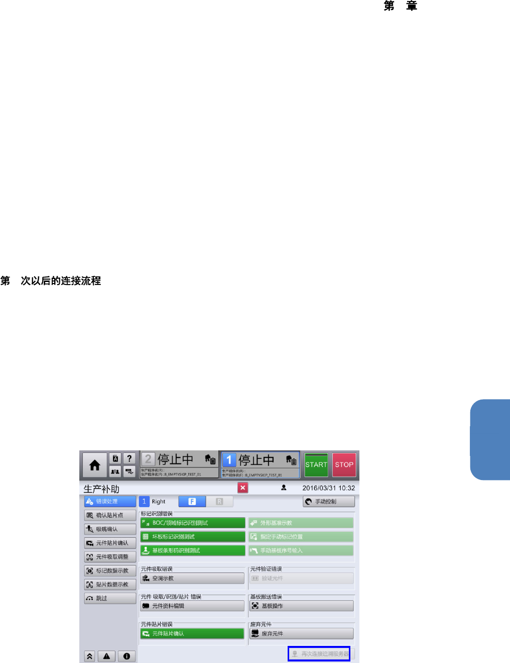 需在机器设置中重新连接服务器恢复通信。发生通信错误后,在从[顶部菜单]触摸[生产补助] - [错