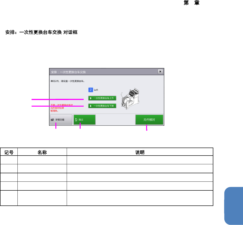 一次性更换台车上升 在显示的对话框中触摸[上升]后,将使一次性更换台车上升并固定。