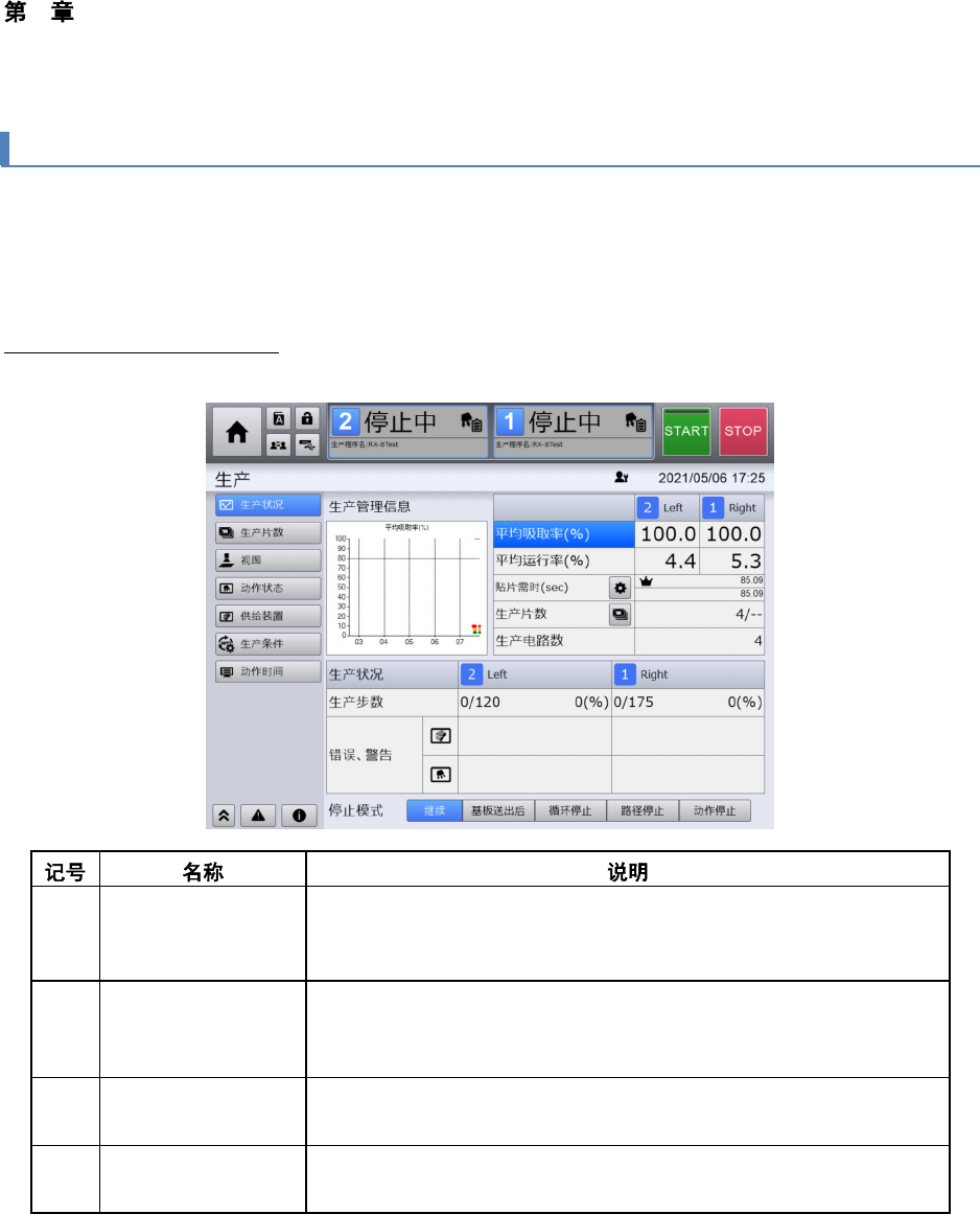 4 操作篇 4-3 生产 38 4-3-3. 生产状况的显示 触摸 [ 生产 ] 中子菜单面板的 [ 生产状况 ] 后,可显示生产 状况画面 。 在生产状况画面中,除了可控制本机生产 的开始, 停止状态之外,还可随时方便地确认生产 中本机内各单 元的运转状况,错误状况,警告状况。此 外,还可通过 图表确认主要生产管理信息 随时间的变化。 显示生产中的生产管理信息 [ 生产状况 ] 画面中将显示以下信息。 (a) 生产管理信息图表 显示生…