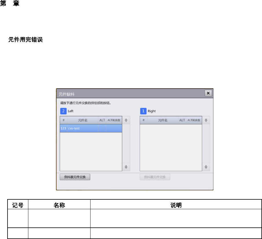 4 操作篇 4-3 生产 52 n 生产过程中发生元件用完时,将显示 [ 元件缺料 ] 对话框。 触摸 [ 元件缺料 ] 对话框中的 [ 供料器元件交换 ] ,显示 [ 元件交换 ] 对话框, 可更换指定单元的元件。 关于元件交换的详情, 请参阅「 4-4-1 元 件交换作业」 。 (a) 元件用完状况列表 显示各单元供给部的元件用完状况。 按供给位置编号分类显 示带式供料器,托盘的元件用完状况。 (b) 供料器元件交换 开始更换供料器…