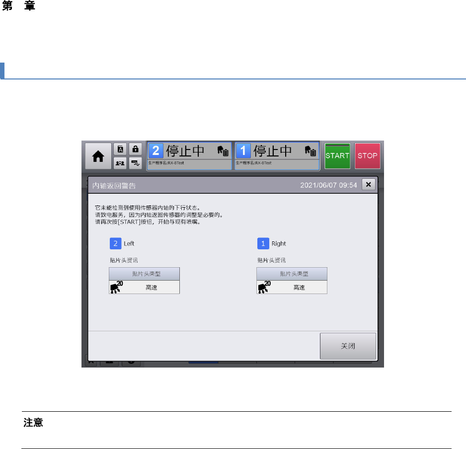 当显示[内轴返回警告] 对话框时,须要进行内轴返回传感器的调整,故请与维修部门联系。再有,如要忽