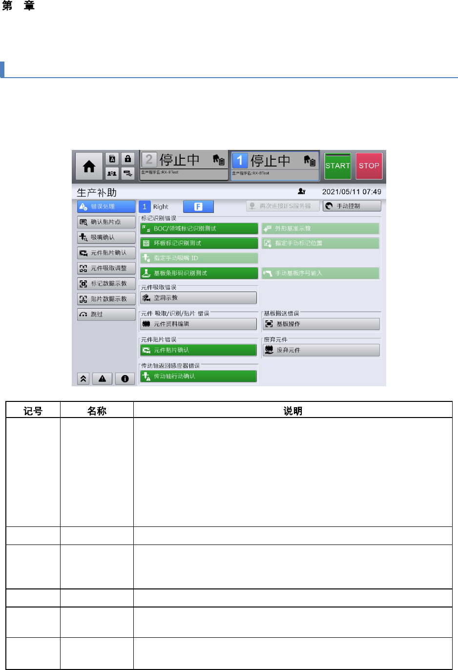 4 操作篇 4-6 生产补助 96 4-6-1. 错误处理 触摸 [ 生产补助 ] 画面子菜单面板中的 [ 错误处理 ] ,显示 [ 错误处理 ] 画面。 [ 错误处理 ] 画面中,将根据生产过程中( 运行中)发生的错误内容,显示相应 的功能对话框,通过各对话 框 中的操作恢复为生产状 态。 (a) 标记识别错误 触摸 [BOC/ 领域标记识别测 试 ] , [ 坏板标记识别测试 ] , [ 指定手动 标记位 置 ] 、 [ 外形基 准…
