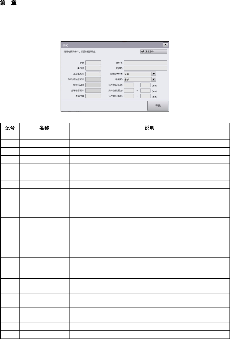 4 操作篇 4-6 生产补助 114 [ 细化 ] 对话框的详情 [ 元件名 ] 和 [ 贴片 I D] 也可 只用字符串的一部分进行搜索。输入项目如果无特别 指定,保持空 栏也可以搜索。 (a) 步骤 指定贴片资料的步骤编 号作为搜索条件。 (b) 电路 ID 指定各种数据所属的电路 ID 作为搜索条件。 (c) 基准电路 ID 指定各种数据所属的基准电路 ID 作为搜索条件。 (d) BOC / 领域标记 ID 指定 BOC / 领…