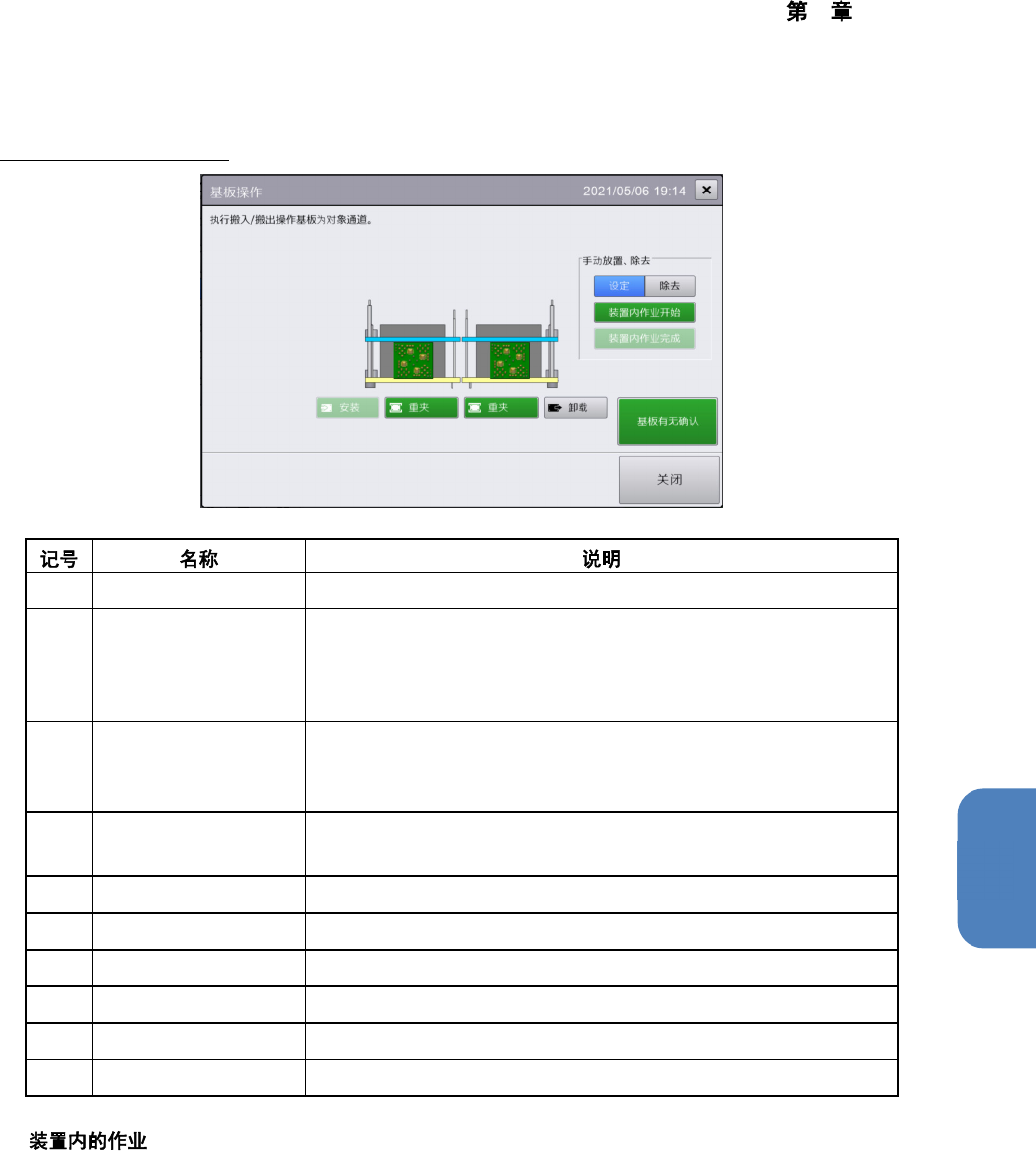 用手动放置基板时,在触摸[设定]后,触摸[装置内作业开始],将基板放到本机内部的作业通道上,然后