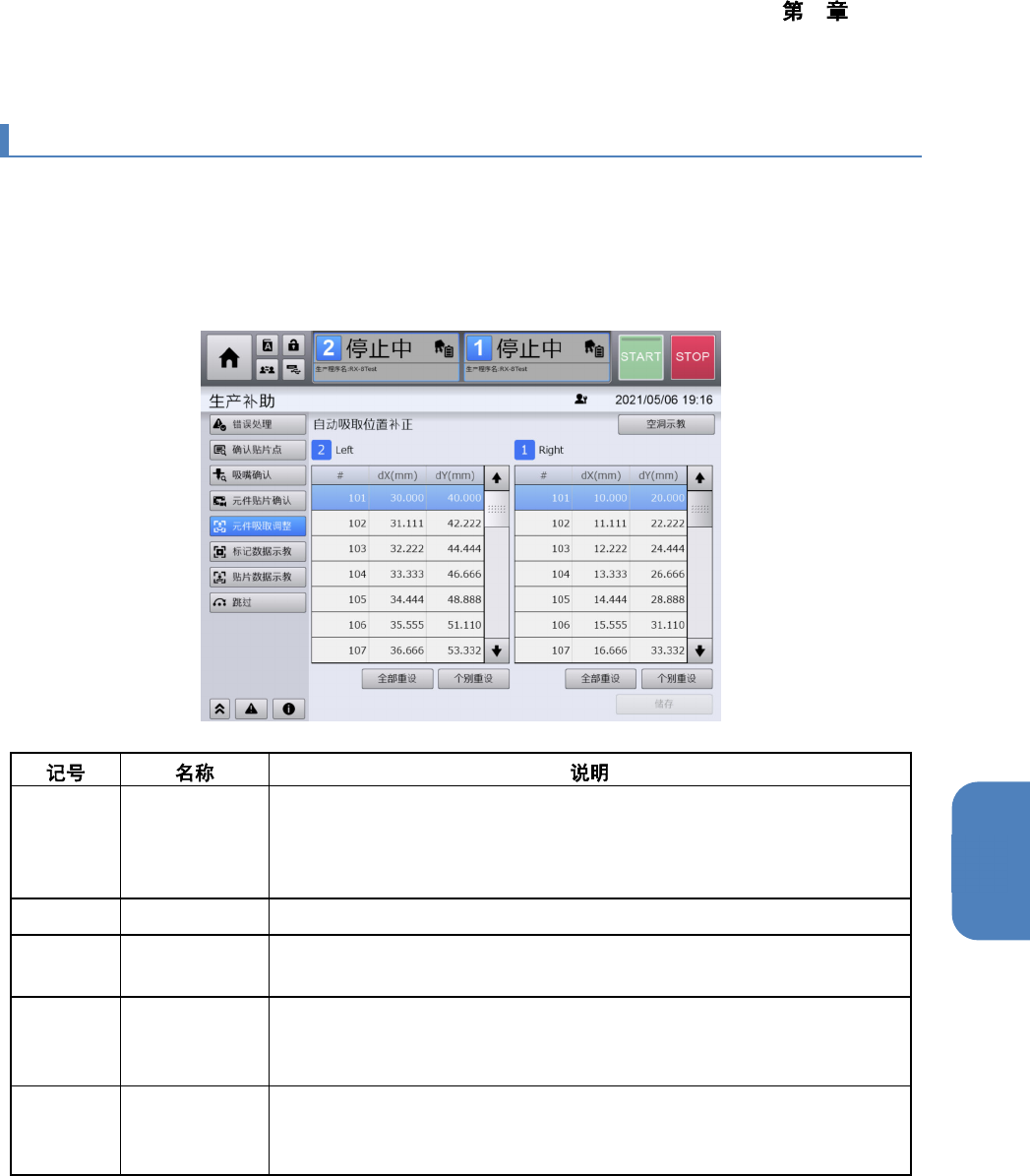 补正值一览 列表显示各单元中各带式供料器供给部的自动吸取位置补正值。
