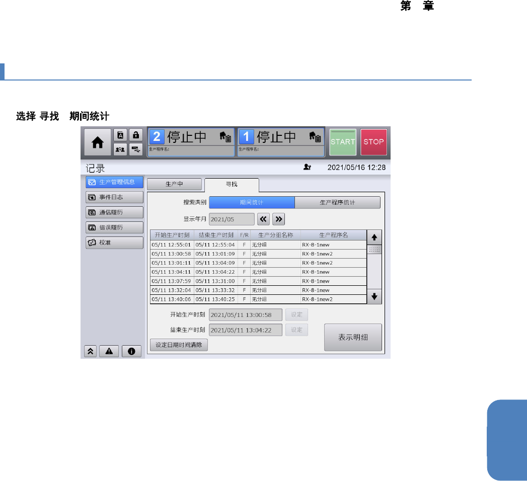 触摸[生产管理信息]画面中的[寻找] - [期间统计] - [显示年月],或按[寻找] - [生产程序统计] - [显示年月]的顺