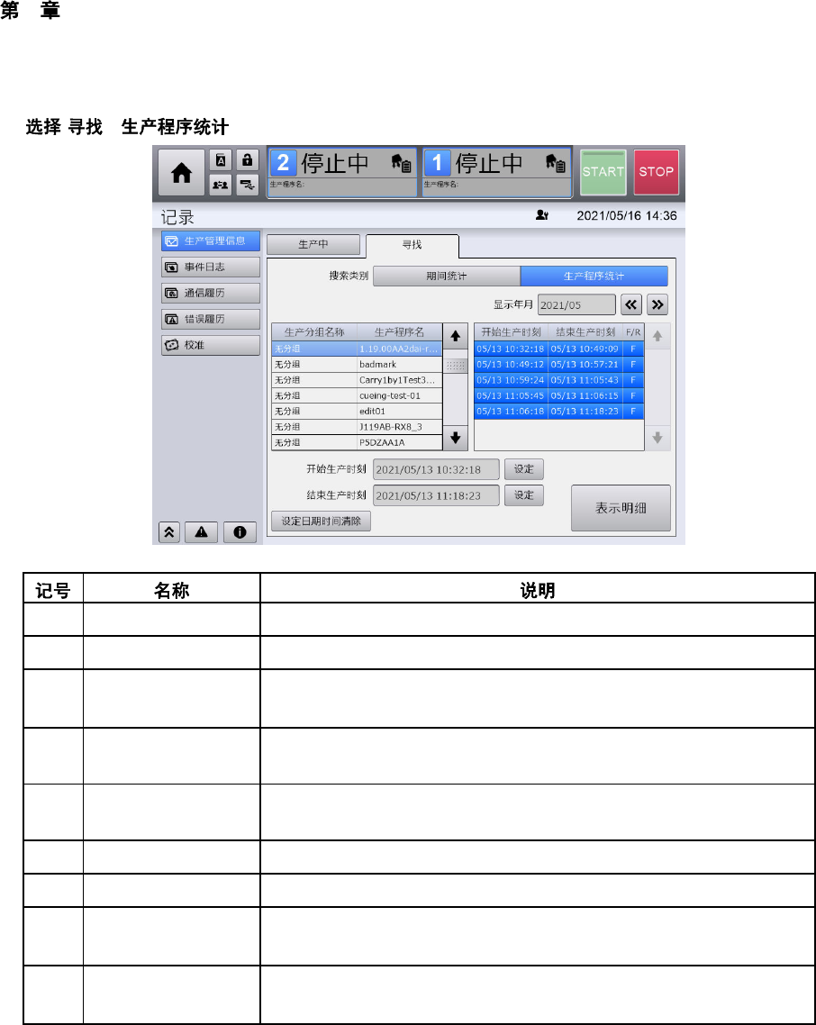 4 操作篇 4-8 记录 147 4 生产批次的切换 触摸 [ 生产管理信息 ] 画面中的 [ 寻找 ] - [ 期间统计 ] - [ 显示年月 ] ,或按 [ 寻找 ] - [ 生产程序统计 ] - [ 显示年月 ] 的顺 序触摸,可显示每个月 的数据。 触摸 / 可更改显示。 [ 寻找 ] - [ 期间统计 ] 中的生 产管理信息列表 开始生产时刻 开始统计 生产管理信息的时间 结束生产时刻 结束统计 生产管理信息的时间 当前正在生…