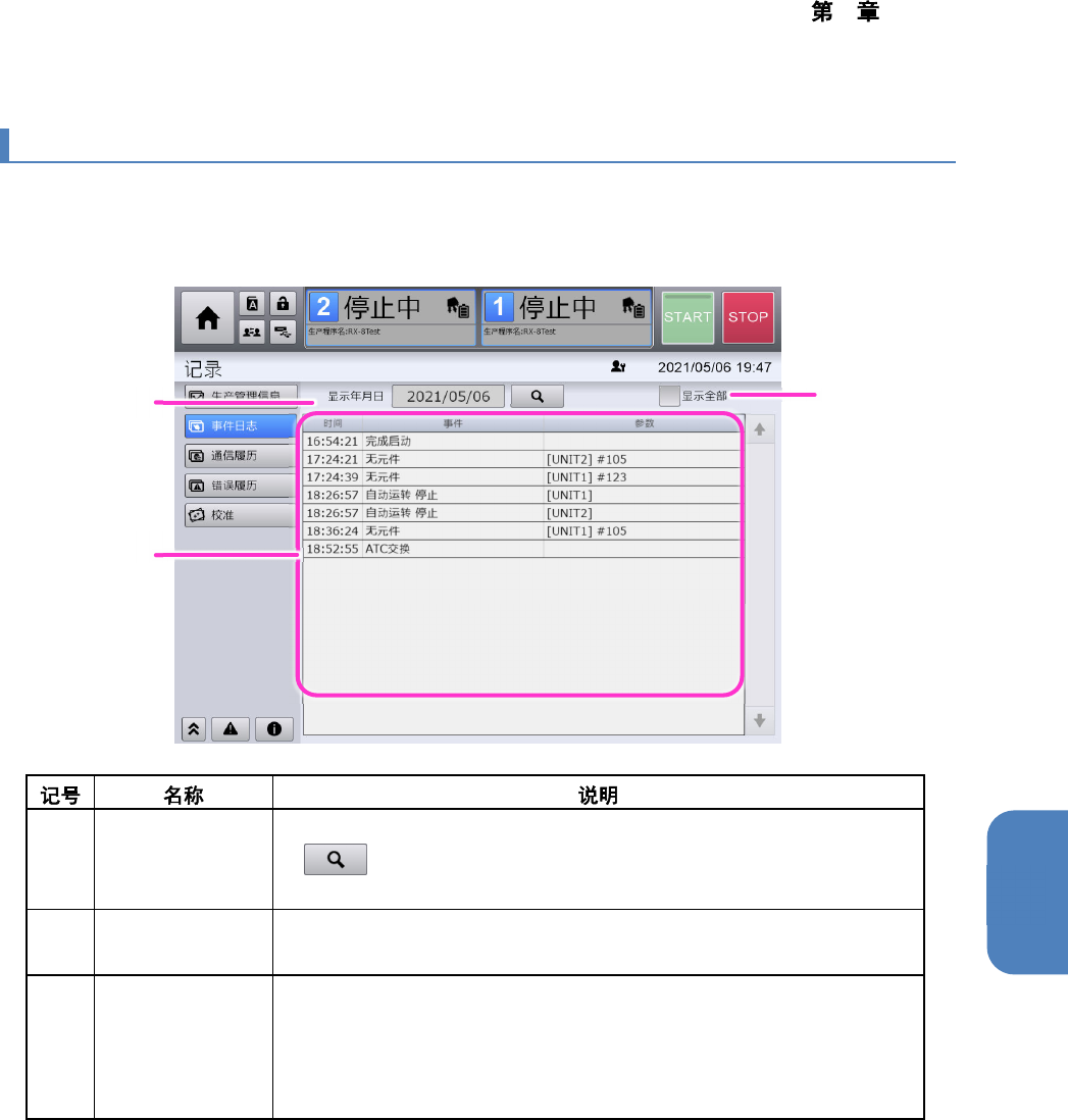 4 操作篇 4-8 记录 149 4 4-8-3. 事件日志 触摸 [ 记录 ] 菜单中的 [ 事件日志 ] ,即显示 [ 事件日志 ] 画面。 [ 事件日志 ] 画面在用户 级别为 [SUPERVISOR( 管理员 )] 或 [MAINTENANCE( 维护 )] 时,才会显示。 (a) 显示年月日 显示事件日志的年月日,还可进行更 改操作。触摸搜索按钮 ( ),将在事件日志列表中显示 [ 显示年 月日 ] 中指定日期的事件 日志。 …