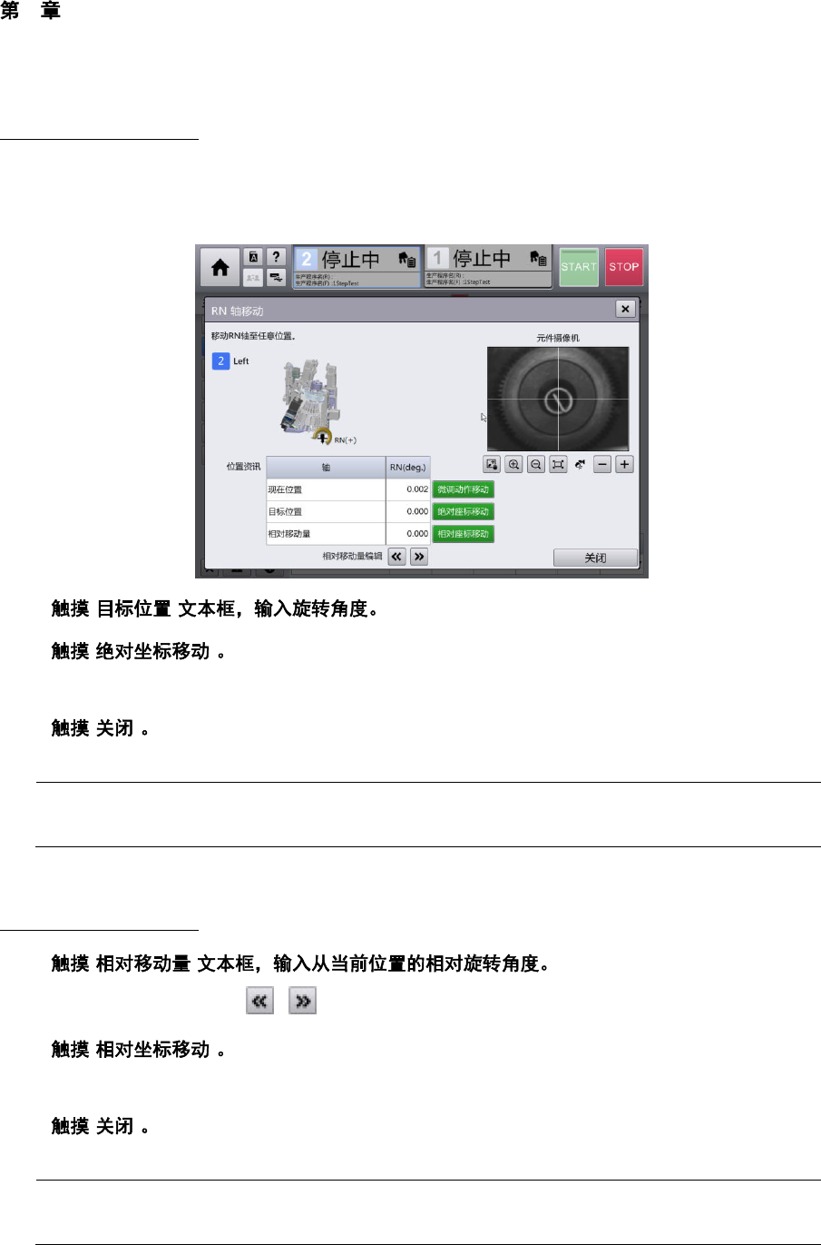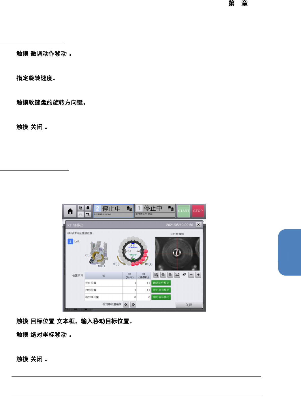 4 操作篇 4-9 手动控制 165 4 吸嘴 RN 轴的微调移动 1 [ ] 显示微调移动的软键盘。 2 触摸 [ 低速 ] 、 [ 中速 ] 、 [ 高速 ] 中的任意 一个。 3 RN 轴将向触摸的方向键方向旋转。 4 [ ] 关闭对话框,返回 [ 贴片头控制 ] 画面。 旋转座 RT 轴的绝对移动 触摸 [ 贴片头控制 ] 画面的 [RT] ,即显示 [ RT 轴移动 ] 对话框。 贴片头类型为高速时,旋转 吸嘴,移动到任意位置…