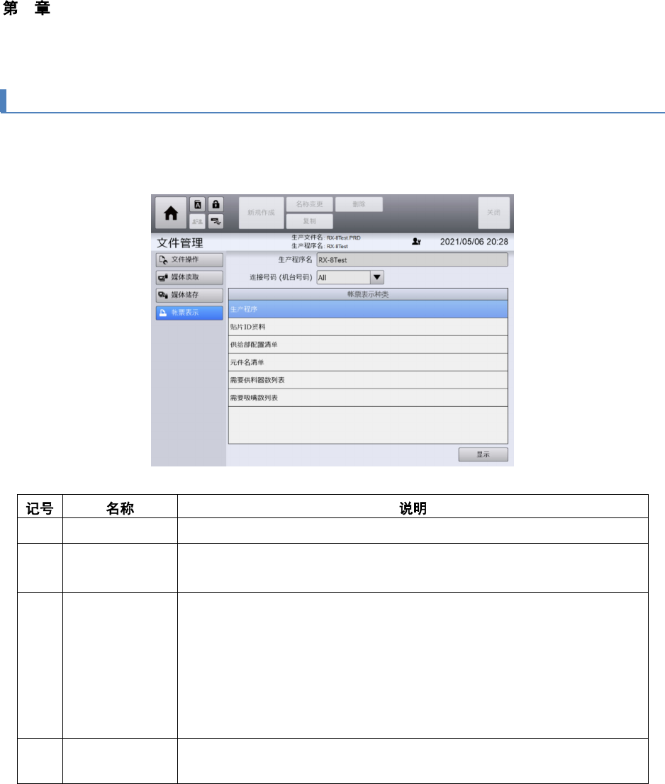 在画面中显示通过[文件操作] 画面打开的生产程序的账票数据(文件数据)。可将账票数据输出到 USB 存
