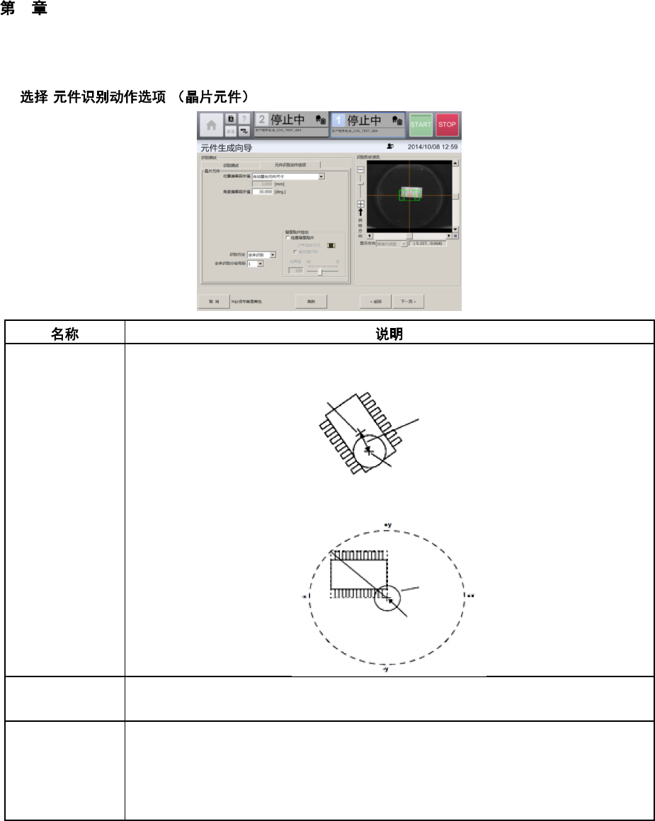 4 操作篇 4-13 元件生成向导 293 4 n [ ] 位置偏离容许值 从下拉列表中选择识别 元件时在哪个范围内进行识别。 • 指定位置:在指定区域内识 别。 • 从元件尺寸自动算出:考虑 角度、角度偏差的容许值,自动设定识别区域后识 别。 角度偏离容许值 对识别得到的元件角度 与预计元件所在的角度有偏差时,容许的角度 偏差量进行设 定。 本体对背景极性 在下拉列表中设定元件主体 和背景的亮度差。 本体辅助样本 指定检测主体时使用的…
