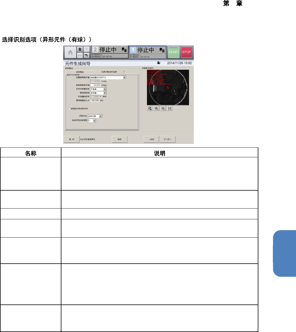 4 操作篇 4-13 元件生成向导 296 n 位置偏离容许值 从下拉列 表中选择识别元件时在哪个范围内进行识 别。 • 指定位置:在指定区域内识 别。 • 自动算出元件尺寸:考虑角度、角度 偏差的容许值,自 动设定识别区 域后识别。 角度偏离容许值 对识别得 到的元件角度与预计元件所在的角度有偏 差时,容许的角度偏差 量进行设定。 本体对背景极性 在下拉列 表中设定元件本体和背景的亮度差。 本体辅助样本 指定检测本体时使用的样品系数。…