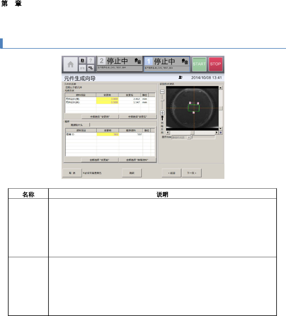 4 操作篇 4-13 元件生成向导 298 4-13-7. 元件边长反映画面 元件形状 注册元件的形状。 • 资料项目:显示可更改元件边长的项 目。 • 变更前:显示更改元件边长前的值。 • 变更后:显示更改元件边长后的值( 输入值)。 • 单位:显示单位。 • 全部选择 “ 变更前 ” :使用更改前的值作 为所有元件形状的设定值。 • 全部选择 “ 变更后 ” :使用更改后的值作 为所有元件形状的设定值。 顺序 注册序列的设定值。 •…