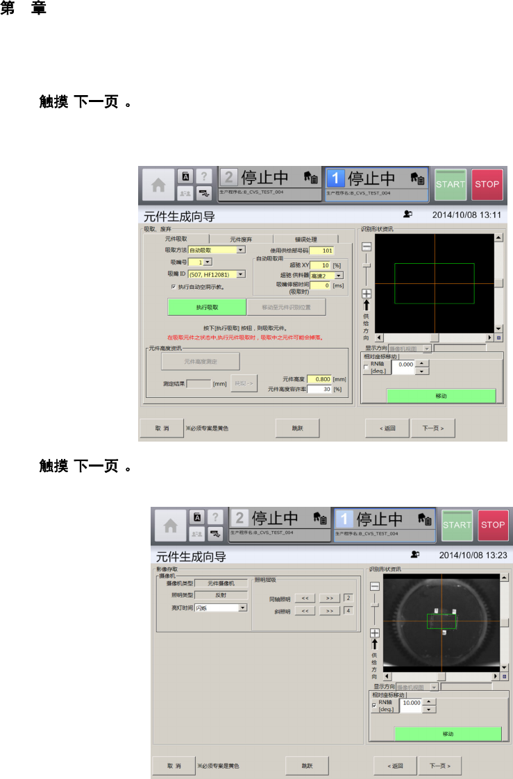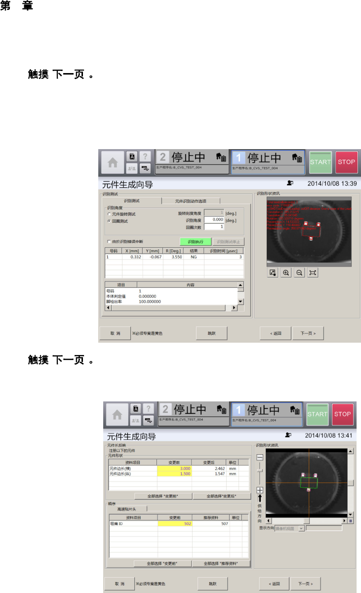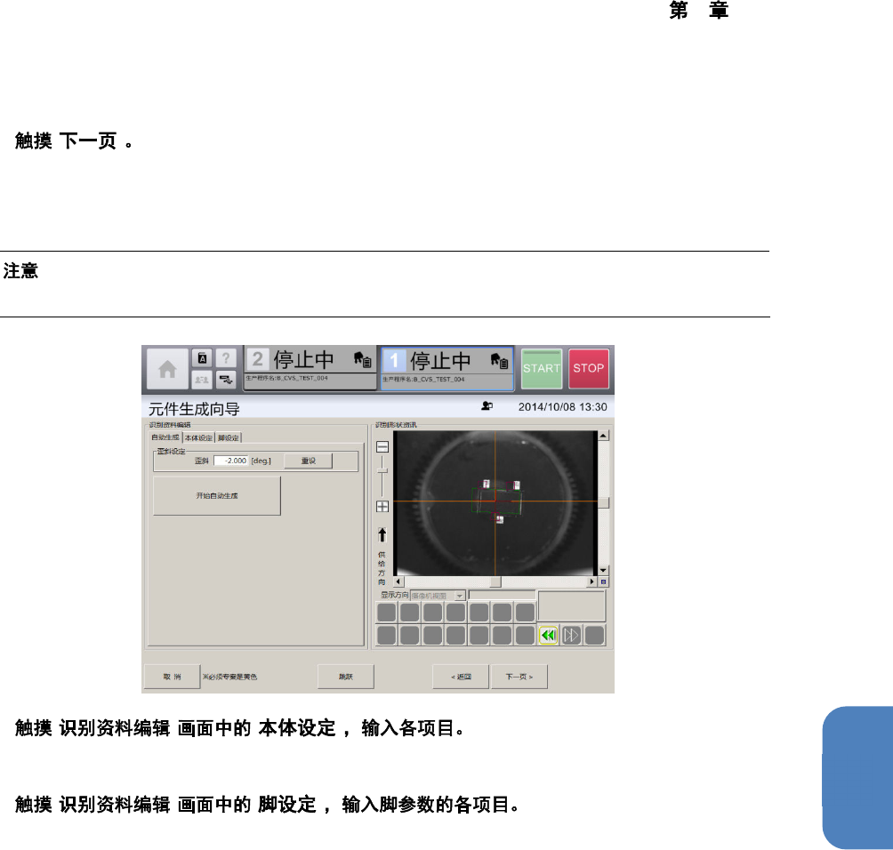 4 操作篇 4-14 数据制作步骤 309 4 9 [ ] 显示 [ 识别资料编辑 ] 画面的 [ 自动生成 ] 选项卡。 [ 自 动 生成 ] 选 项 卡, 可在 [ 吸 取、 废 弃 ] 画 面中 吸取 元件 时 ,自动 从 摄 像机图 像 制作 脚元 件的 识 别 数据。 Ÿ 根据本体或脚的形状的复杂程度、摄像机图像 拍摄时的照明条件 ,有时自动生成会失败。 10 [ ] [ ] [ 本体设定 ] 选项卡,可对元件的外形尺寸 、以…