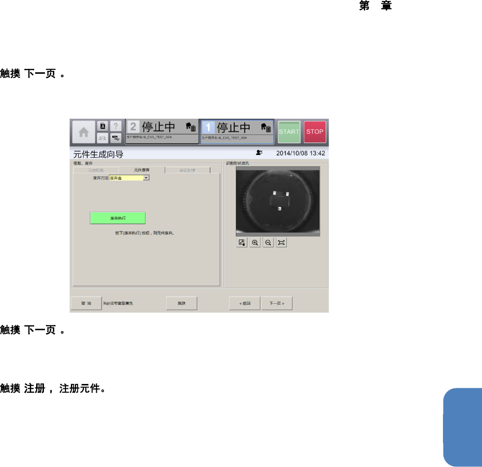4 操作篇 4-14 数据制作步骤 311 4 14 [ ] 贴片头吸取元件过程中,会显示 [ 吸取、 废弃 ] 画面。 废弃吸取中的元件。 15 [ ] 显示 [ 确认注册信息 ] 的确认画面。 触摸 [ 表示明细 ] ,即显示注册元件的详 细信息。 16 [ ] 结束元件生成向导,返回 [ 编辑数据 库 ] 画面,元件注册完成。