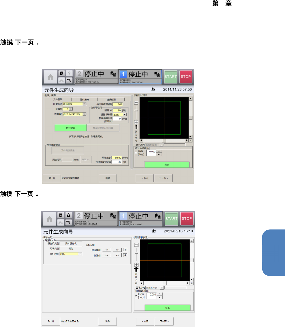 4 操作篇 4-14 数据制作步骤 313 4 7 [ ] 显示 [ 吸取、废弃 ] 画面。 以摄像机图像为基础制作、编辑元件 数据时,应使 吸嘴吸取元件。 8 [ ] 显示[影像存取]画面。