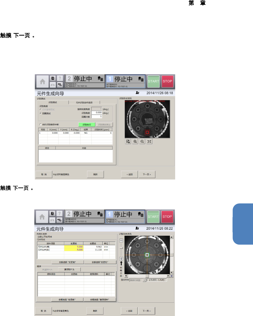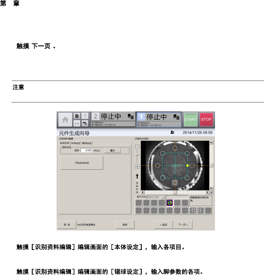 4 操作篇 4-14 数据制作步骤 315 4 12 [ ] 显示 [ 识别测试 ] 画面。 [ 识别测试 ] 选项卡,可在 [ 吸取、废弃 ] 画面中吸取元件时,使用 [ 识别资料 编辑 ] 画面中制作的元件识别 数据,对元件进行识别 测试。 [ 元件识别动作选项 ] 选项卡,可对元件 识别功能或背 面贴片检测功能的详细参数进行设定。 13 [ ] 在 [ 基本信息 ] 画面中,变更 [ 元件形状 ] 的元件边长(横)或元件边长(纵)…