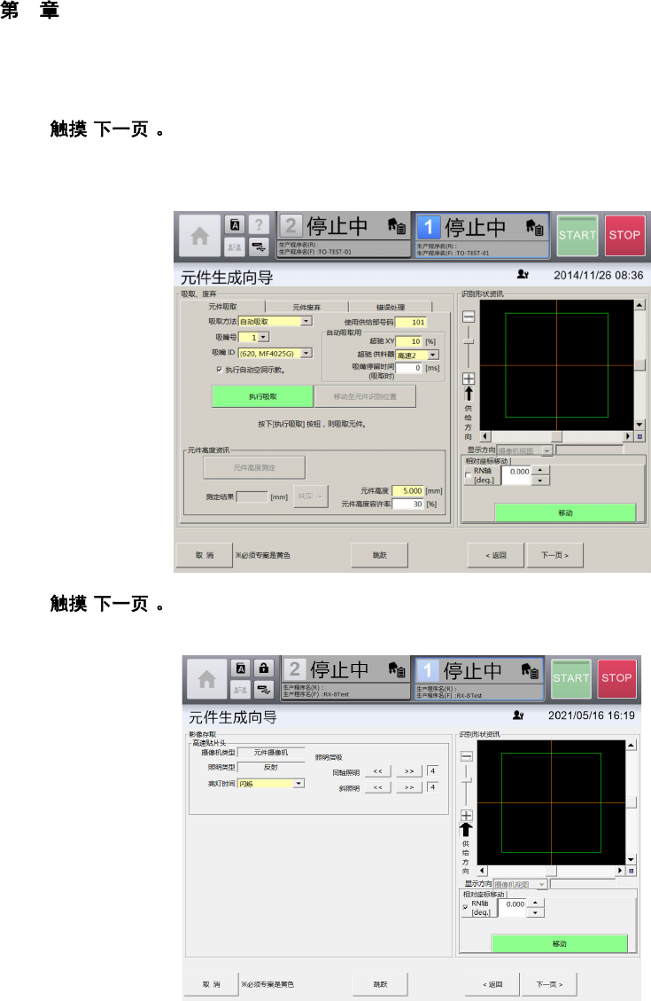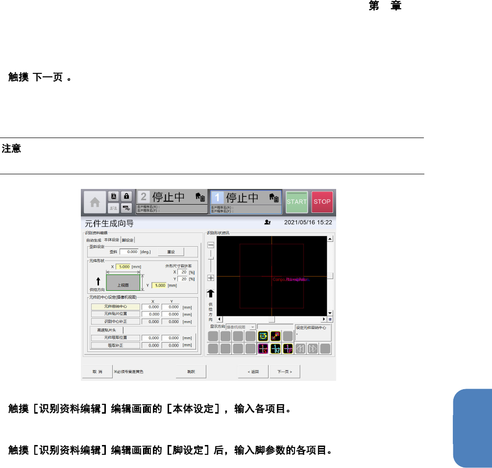 4 操作篇 4-14 数据制作步骤 322 7 [ ] 显示 [ 吸取、废弃 ] 画面。 以摄像机图像为基础制作、编辑元件 数据时,应使 吸嘴吸取元件。 8 [ ] 显示[影像存取]画面。
