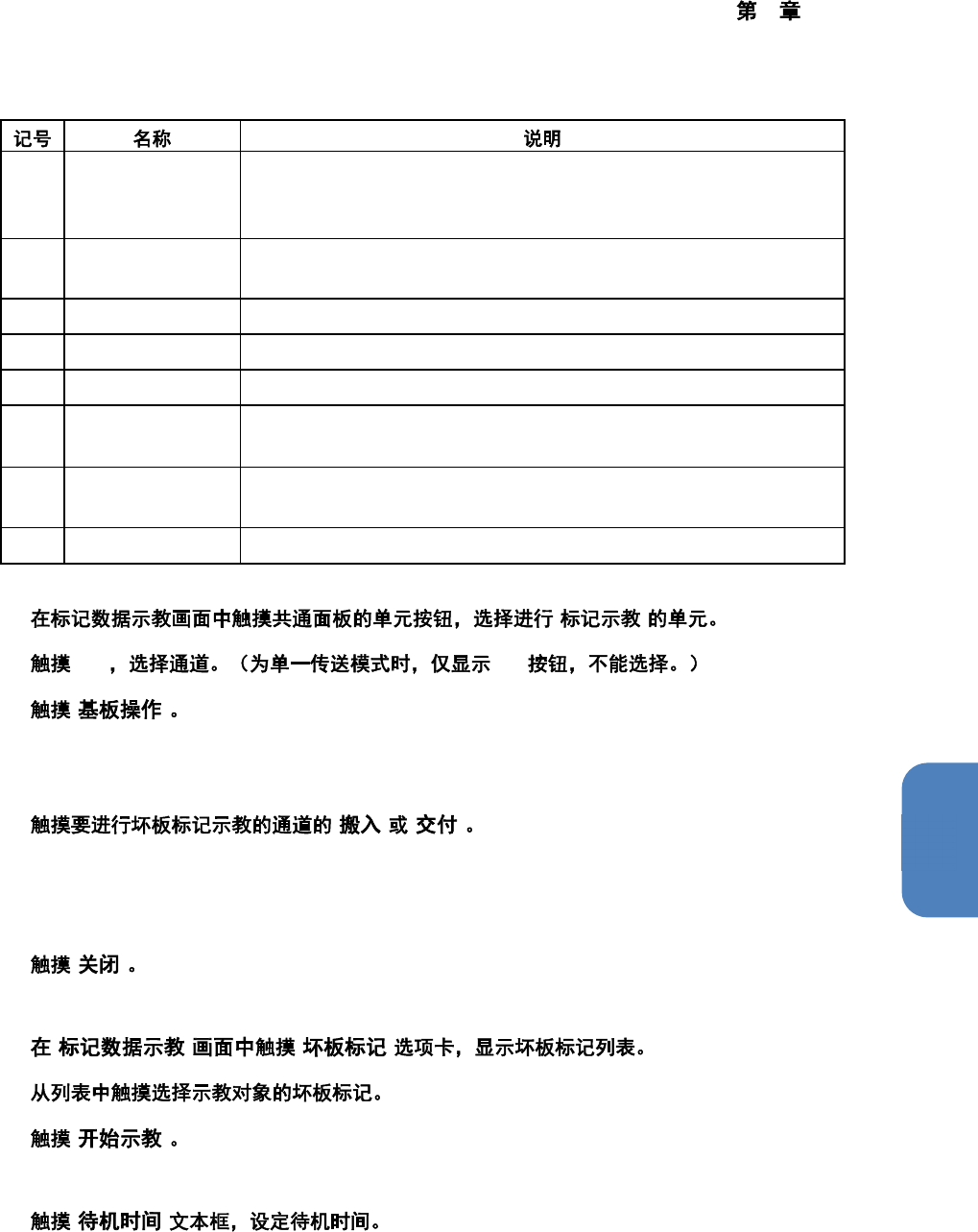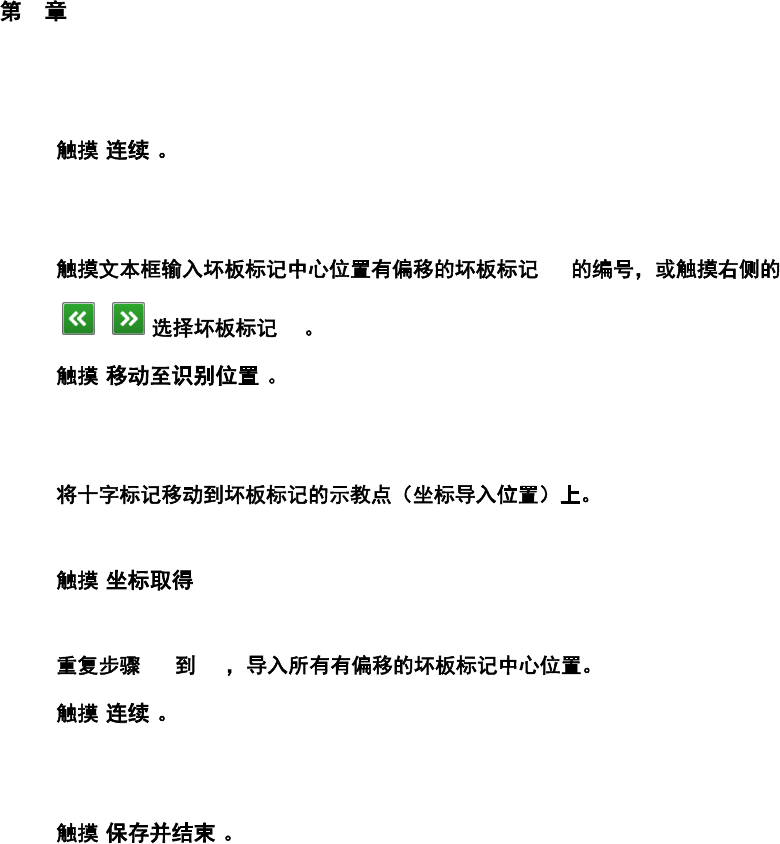 4 操作篇 4-15 示教 366 10 [ ] 摄像机将向所有坏板标记的中心位置连续 移动。确认与坏板标记中心 位置的偏移。 触摸 [STOP] 即可中断。 11 ID / ID 12 [ ] 摄像机将移动到示教对象的坏板标记中心 位置,并显示 红色十字标记。 如果该点已经导入了坐标,则会在摄像机 图像的坐标导入完成位 置上显示绿色的固定十字标记。 13 摄像机图像中显示坏板标记的示教点 时进行十字标记操作,其他 情况下进行微调移动。…
