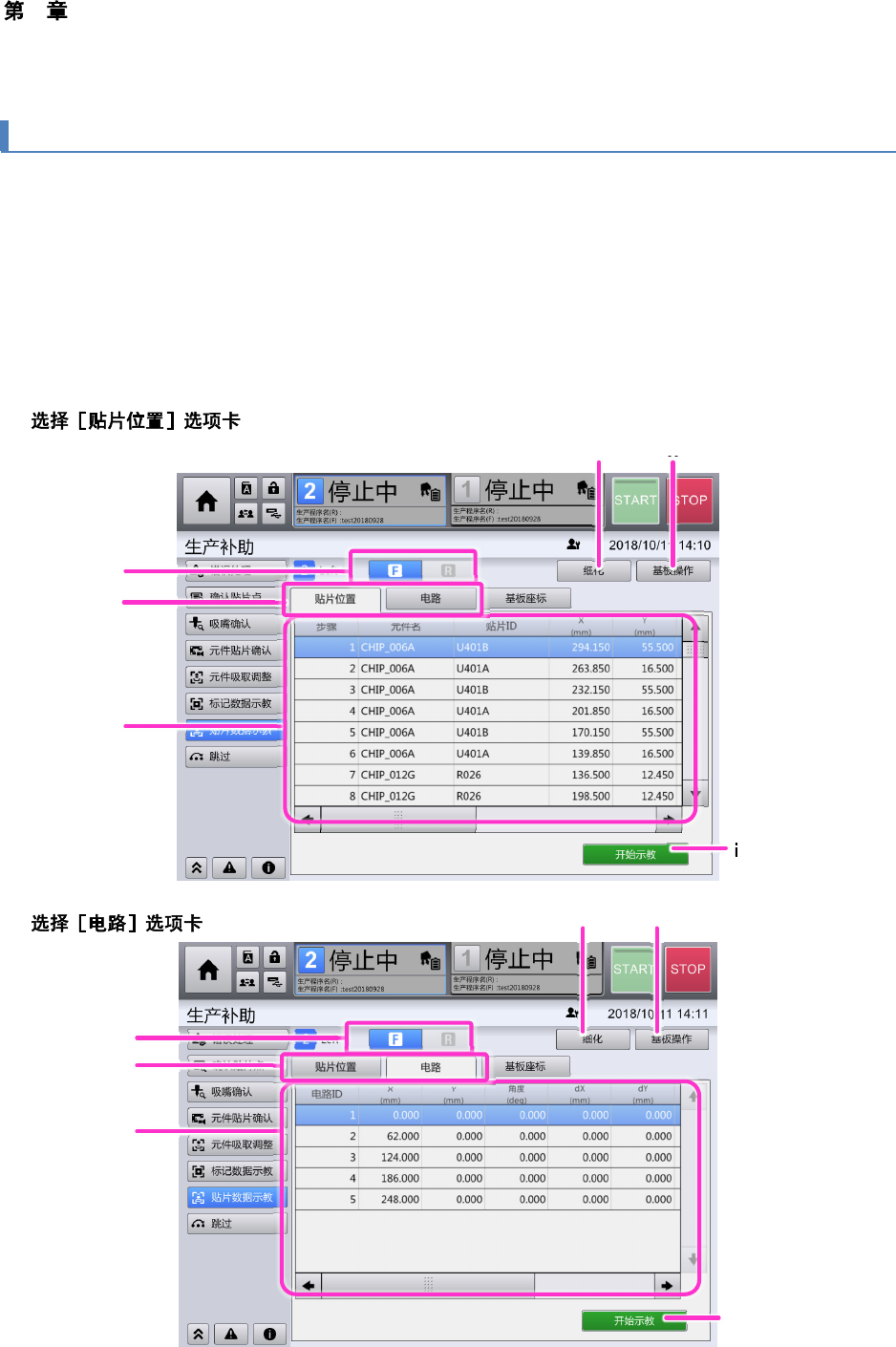 4 操作篇 4-15 示教 376 4-15-4. 贴片数据示教 在 [ 贴片数据示教 ] 画面中,可测量生产 程序的贴片数据中设定 的贴片位置( Land 位置),测定电路基准位 置在基板上的展开位置 ,在作为电路展开量进行修正的 示教作业中,可确认测量对 象的贴片及电路数据, 并细化显示,还可设置测量用的基板。 并且,在因批号更换等 造成基板上多个电路的位置 均变大时,可以对基板坐标偏移量值进行示教 ,补正整 块基板的偏移。 在顶部…