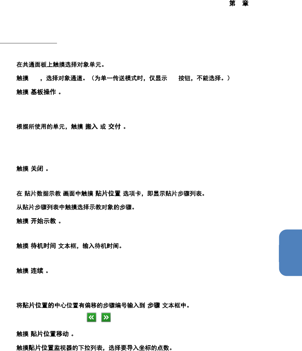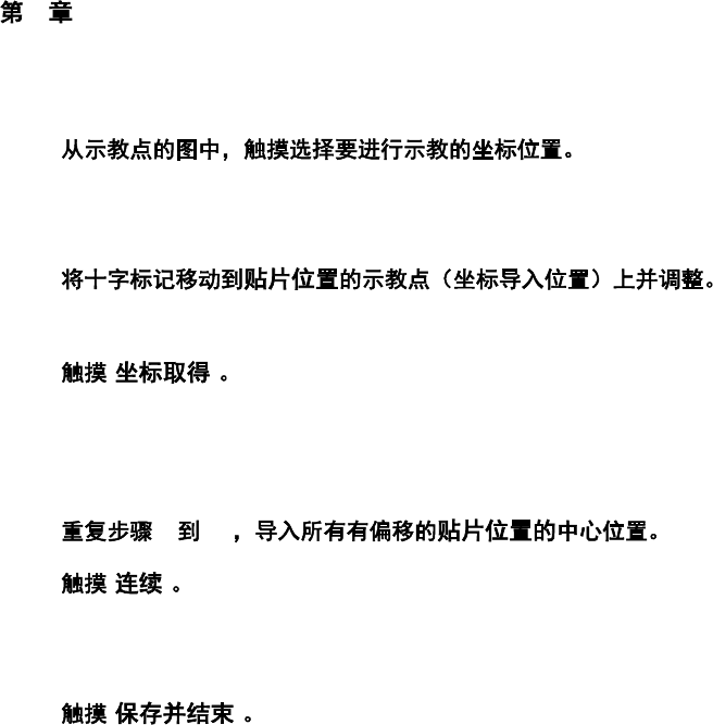 4 操作篇 4-15 示教 382 14 摄像机将移动到示教对象的贴片位置中心 位置,并显示 红色十字标记。 如果该点已经导入了坐标,则会在摄像机 图像的坐标导入完成位 置上显示绿色的固定十字标记。 15 摄像机图像中有贴片位置的示教点时进行 十字标记操作,其他情况下进行微调移动。 16 [ ] 将更新贴片位置的中心位置坐标。 进行 2 点以上目标位置的示教时,重复步 骤 14 到 16 ,导入第 2 点之后的坐标位置 ,触摸 [ 计算…