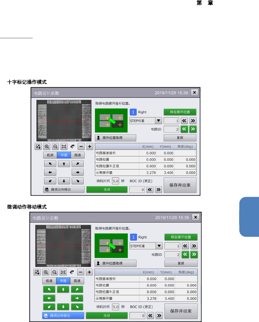 摄像机图像中有贴片位置的示教点时进行十字标记操作,其他情况下进行微调移动。
