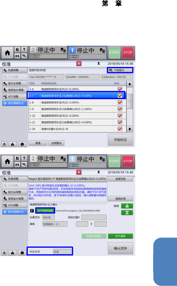 4 操作篇 4-16 校准 405 4 5 . 贴装精度补正 5 - 1 . 选择角度群组转写补正结果确认 选择『角度群组转写补正结果确认 (R ) (Z=0 、 100%) 』,选择『个别显示』。 ※ Z : Z 轴的高度 ( 有 0 、 2 、 4 。 ) 100% :各轴的动作速度 ( 超驰 ) 5 - 2 . 选择生产程序 选择『生产程序切换』。