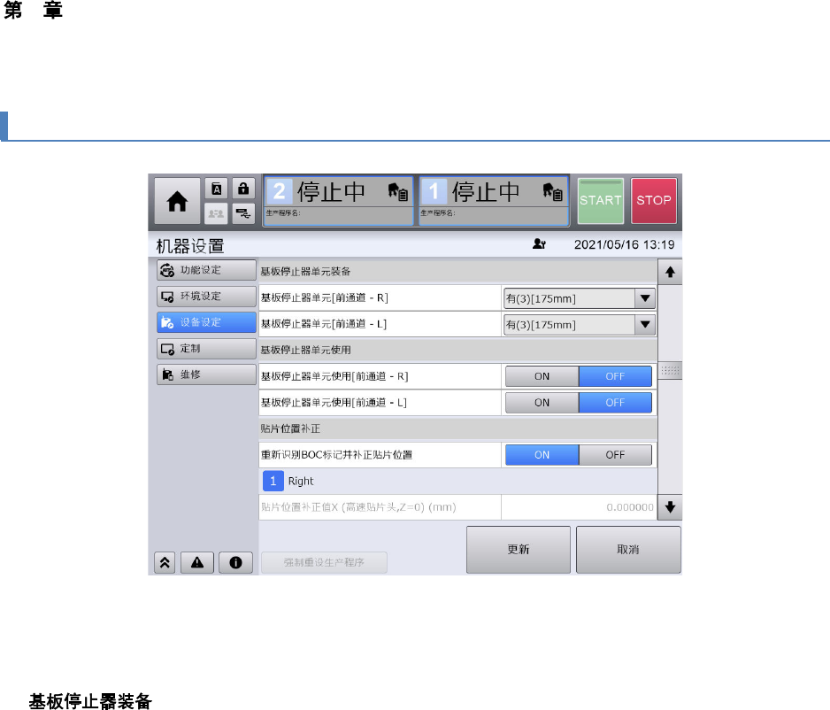 使用基板停止器功能时,请在[装置设定]画面,设定[基板停止器装备]、[基板停止器使用]。