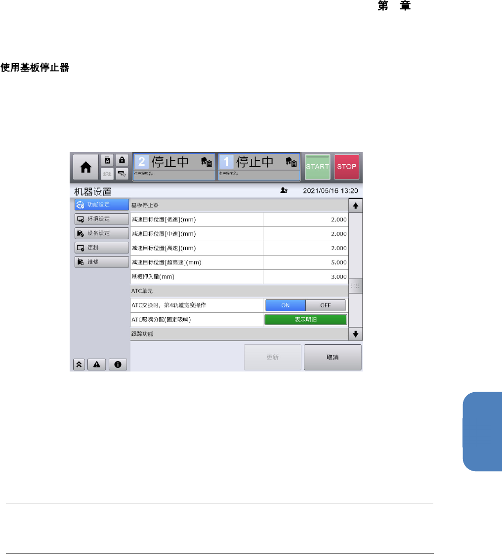 在[功能设定]画面,可以对使用基板停止器时的基板传送[减速目标位置]及[停止器抵住时的基板押入