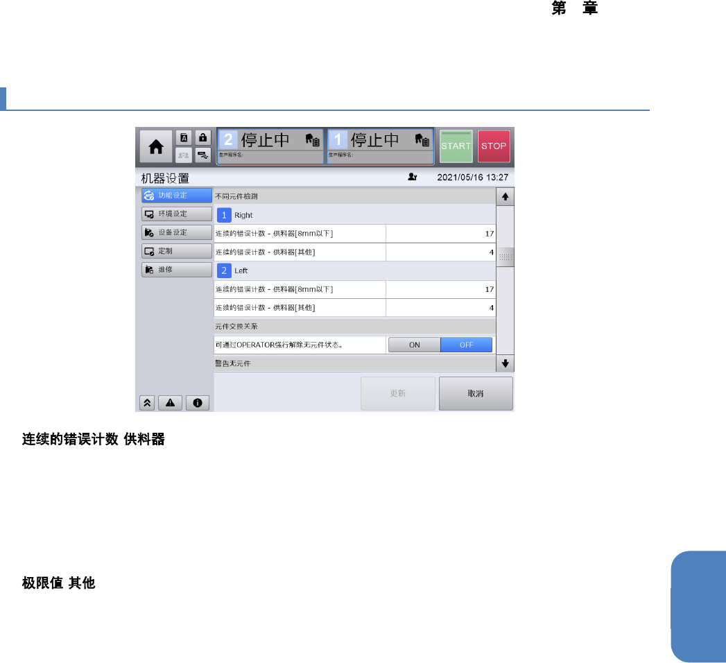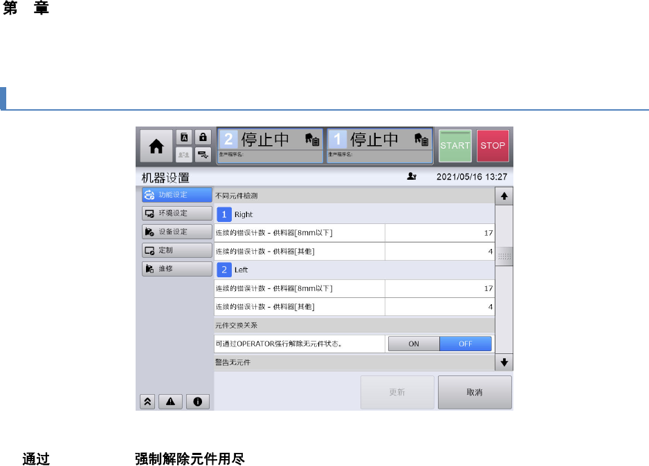 4 操作篇 4-17 机器设置 438 4-17-13. 元件交换关系 n OPERATOR 指定为 ON 后,因 OPERATOR 权限强制解除元件用尽状态。 ( 初始值 : OFF) 。