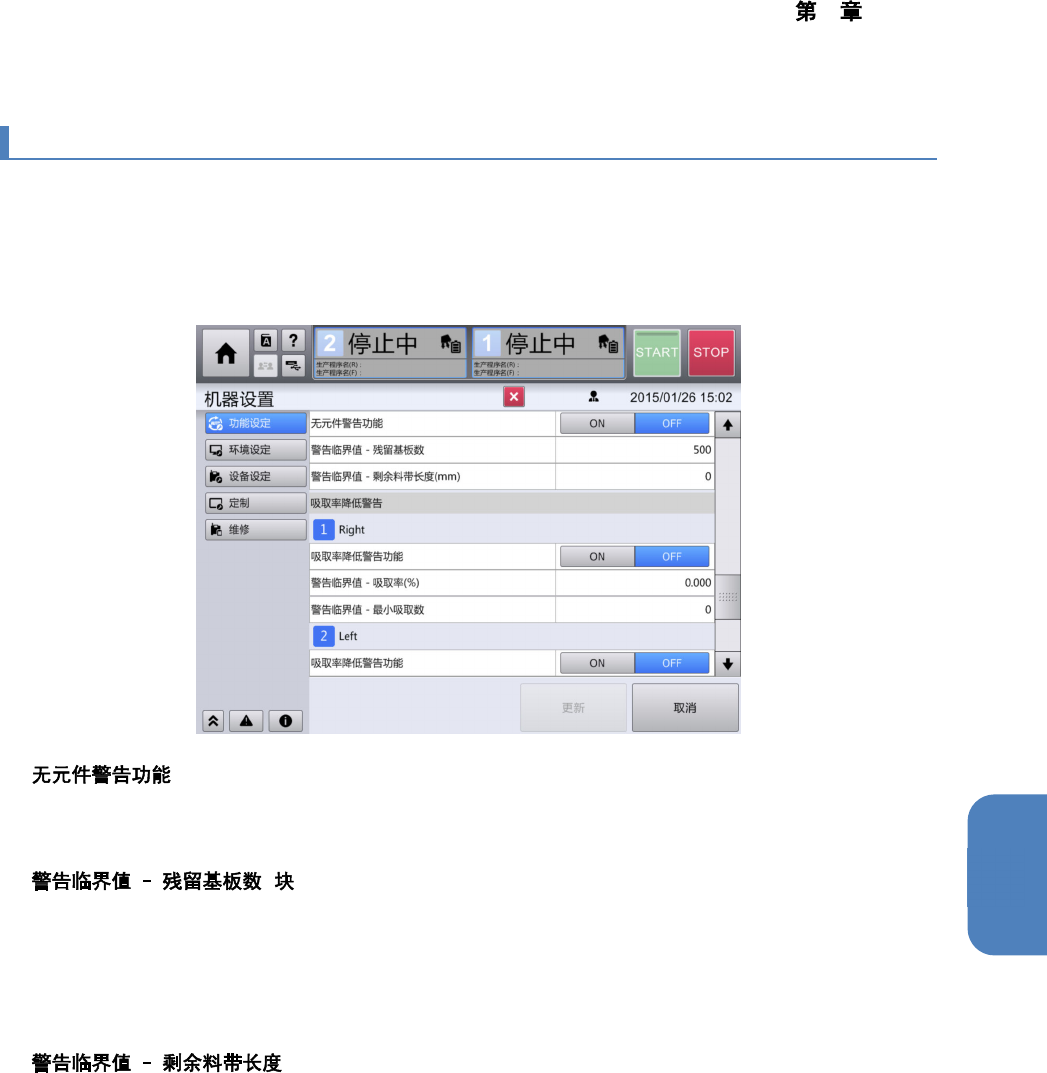 设定为 0 时,不会因剩余料带长度进行元件警告。(数值范围为 0~10000)。(初始值: 0) 。
