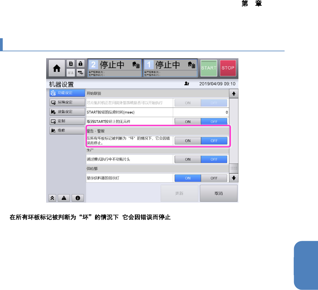 4 操作篇 4-17 机器设置 443 4 4-17-19. 警告 ・ 警报 n , 为 [ON] 时,机器的左右单元在识别坏 板标记时,如 果识别的对象单元坏板标记全部 被判断为“坏”,则 判断需要确认基板或生 产程序而错误停止。 为 [OFF] 时,即使检测到坏 板标记,也不执行错误停止。(初始值: [ON] ) 所有坏板标记均为错误 ,执行错误停止时,请通过 示教功能确认坏板标记的状态, 根据需要对参数进行 调整。再次通过 [ST…