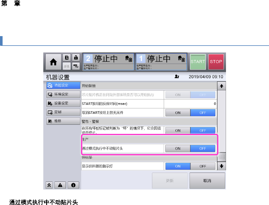 设定为 ON,则运转模式设定为空模式,在开始生产时贴片头不动作。(初始设定:OFF)