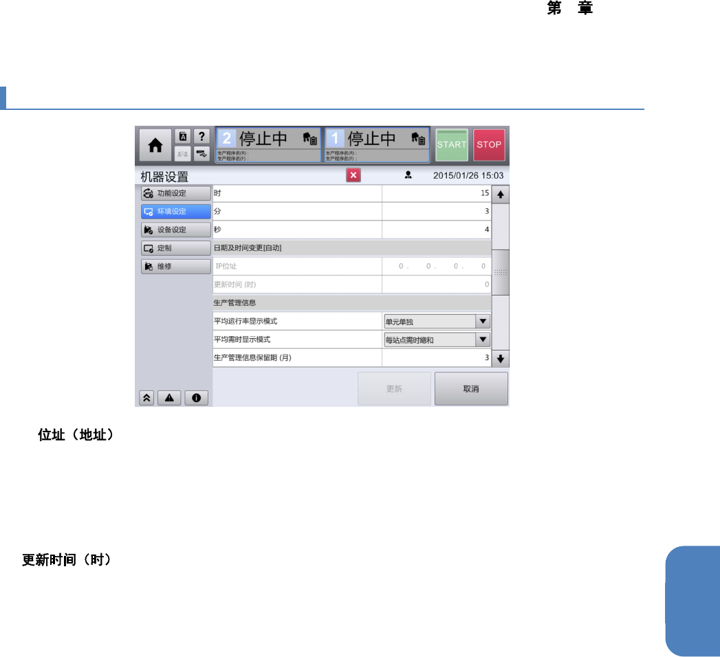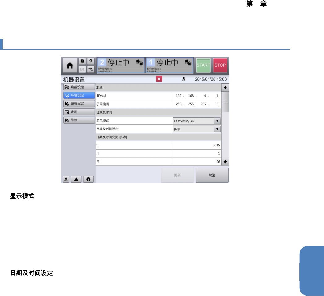4 操作篇 4-17 机器设置 450 4-17-26. 日期及时间变更 [ 手动 ] n / / / / / 手动输入要设定的日期 时间信息。 当按下 [ 更新 ] 按钮时,即可确定。 ( 初始 值 : 当前设定的日期时间 ) 。