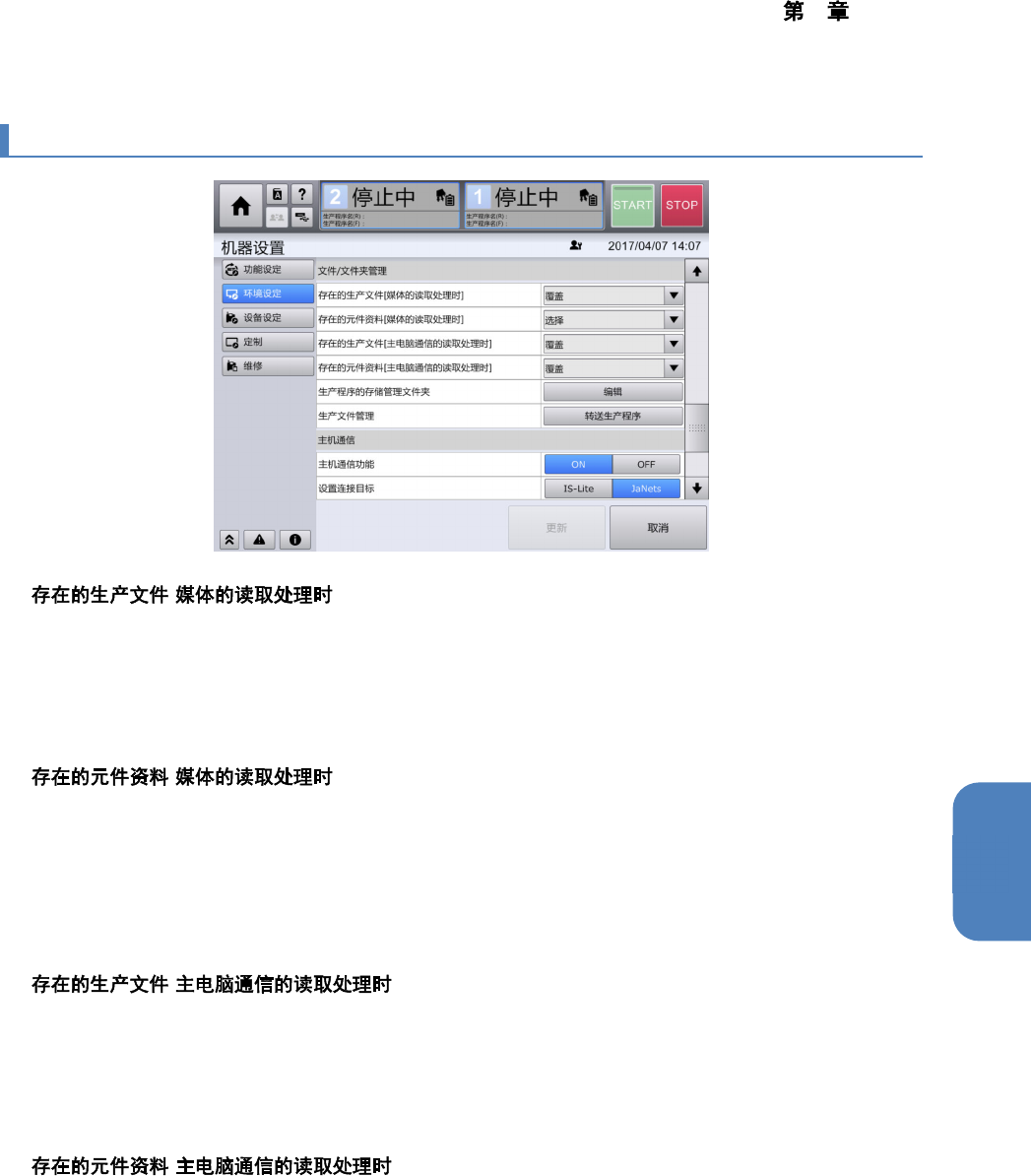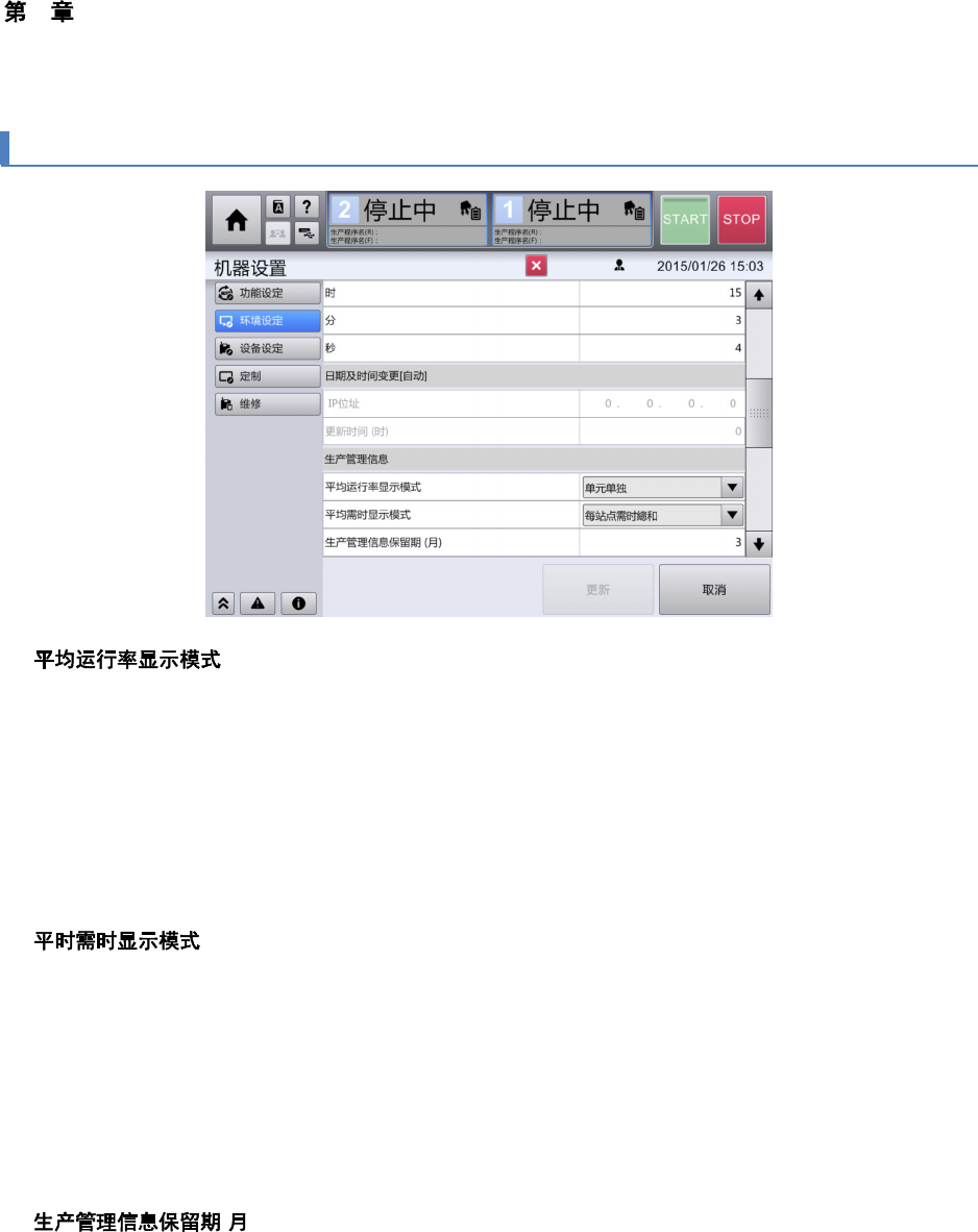 4 操作篇 4-17 机器设置 452 4-17-28. 生产管理信息 n 指定在生产>生产状况画面 、以及生产>生产数量画面 中显示的平均运行率的计算方法。 「单元单独」:除去基 板等待时间、其他单元等待 时间,按照运行时间统计的平均运行率。 「单元相互」:不包含 基板等待时间,但其他单元 等待时间作为运行中处理统计平均运行率。 「单元综合」:将基板 等待时间,以及其他单元等 待时间作为运行中处理统计的平均运行率。 ( 初始值 : 单…