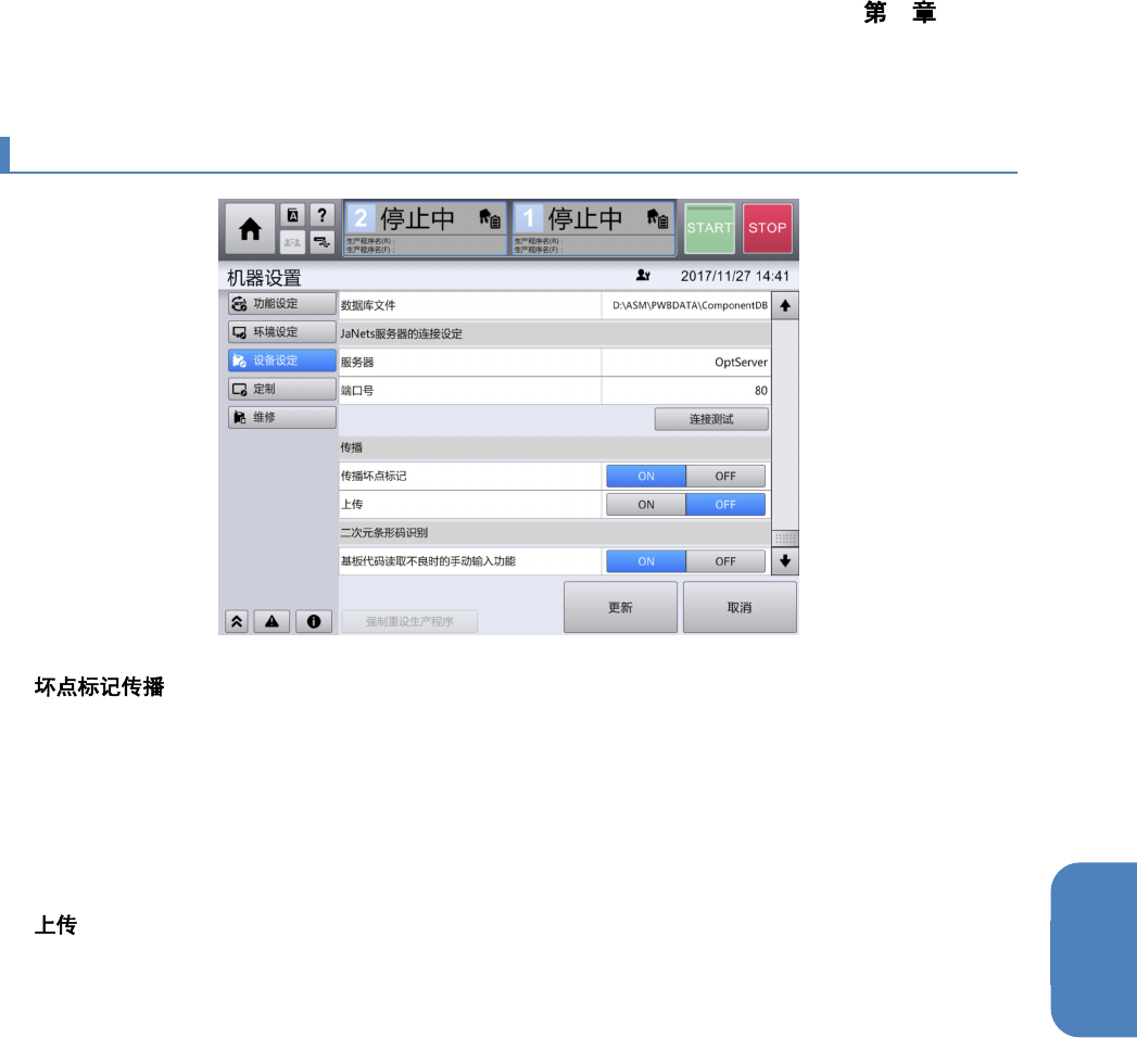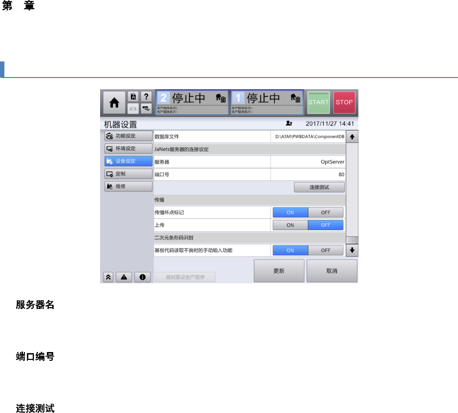 4 操作篇 4-17 机器设置 472 4-17-46.JaNets 服务器的连接设定 n 输入 JaNet s 服务器的计算机名或者 IP 地址。 n 输入端口编号。 n 执行与 JaNet s 服务器的连接测试。 设定发生变更时,在执 行更新后才能进行连接测试 。