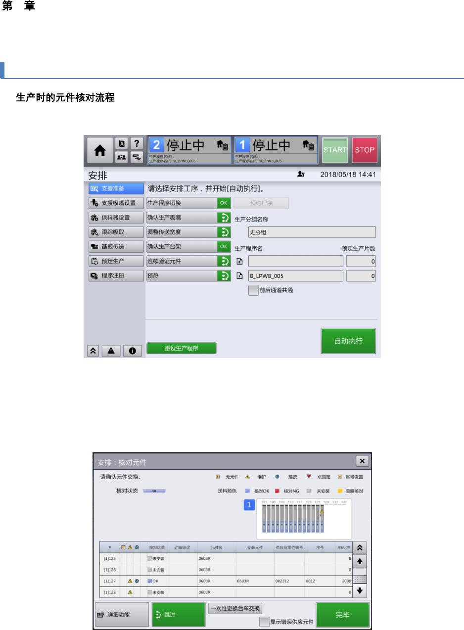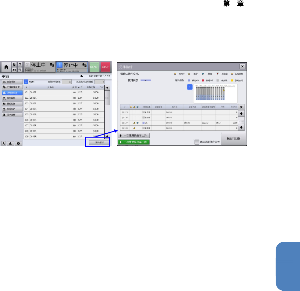 (5) 执行准备后的核对状态的确认,也可通过[顶部菜单] – [安排] – [供料器设置] 画面,在触摸[元件核对]