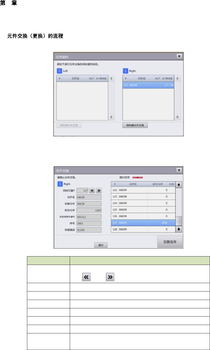 (2) 在[元件缺料] 对话框中触摸发生元件用完单元的 [供料器元件交换] 按钮,即显示[元件交换]对话框。
