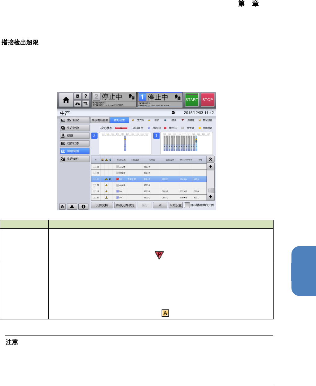 4 操作篇 4-18 IFS-NX 的使用(选项) 501 4 n 搭接操作后,如果按照搭接区域元件数 传送元件也检测不到搭接 点时,将按搭接检出超限错误 使装置停 止运行。 在 [ 元件交换 ] 画面或 [ 供给装置 ] 画面中进行 [ 点 ] 或 [ 区域设置 ] 操作后,核对错误 即被解除,变为可开始 生产状态。 项目 说明 点 通知搭接点。搭接状态被解除。仅在 当前已装入的元件被搭接,才能选择此项 。 设定的点,会在生产开始时反…