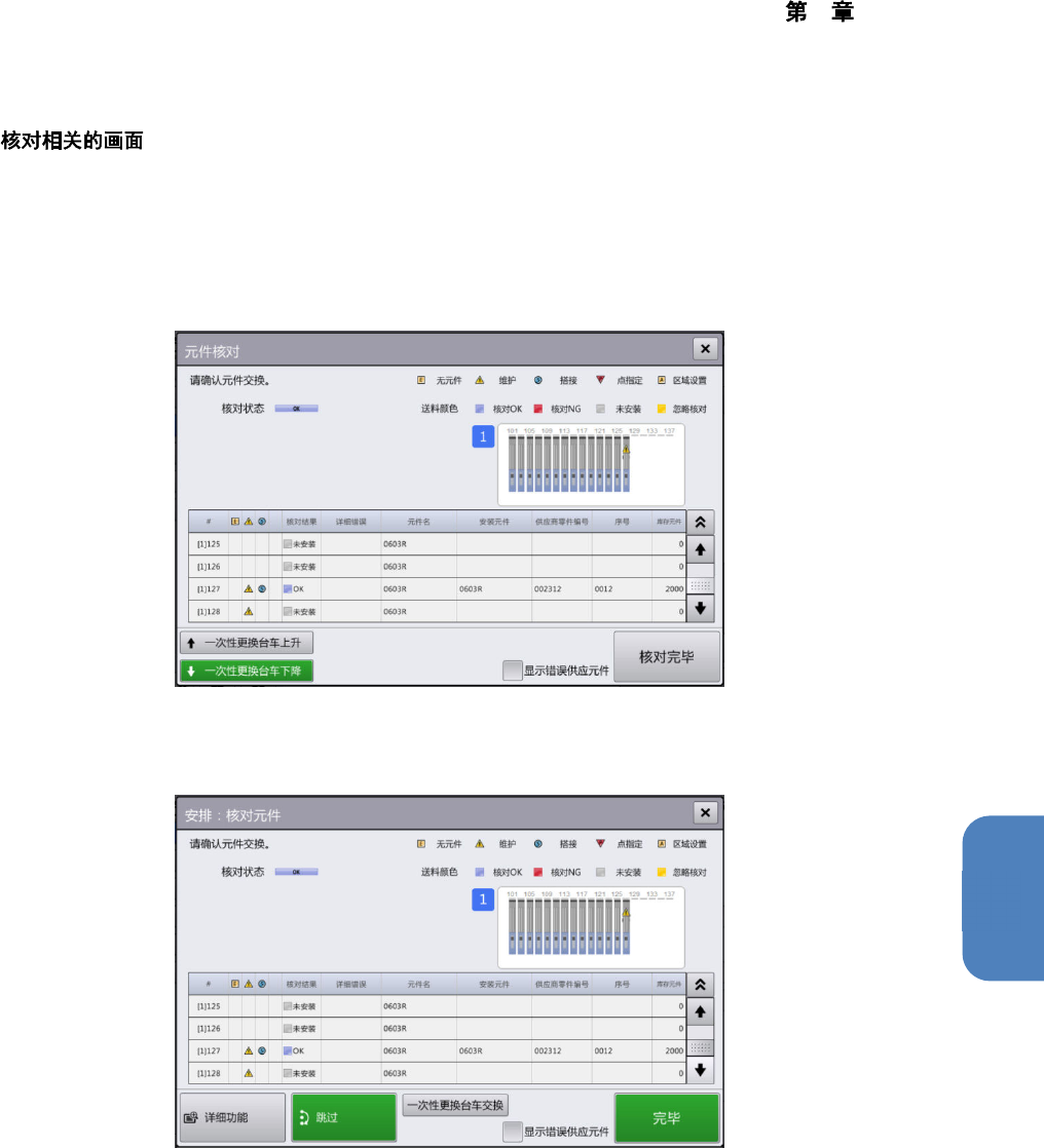 的核对操作。正确完成了拼接核对时,核对结果为「OK」,可以使用对象供料器重新开始生产。