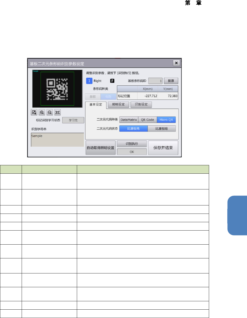 (14) 在[基板 2 次元条形码识别条件设定] 对话框中进行了参数调整及使用识别执行进行学习数据的制作后,