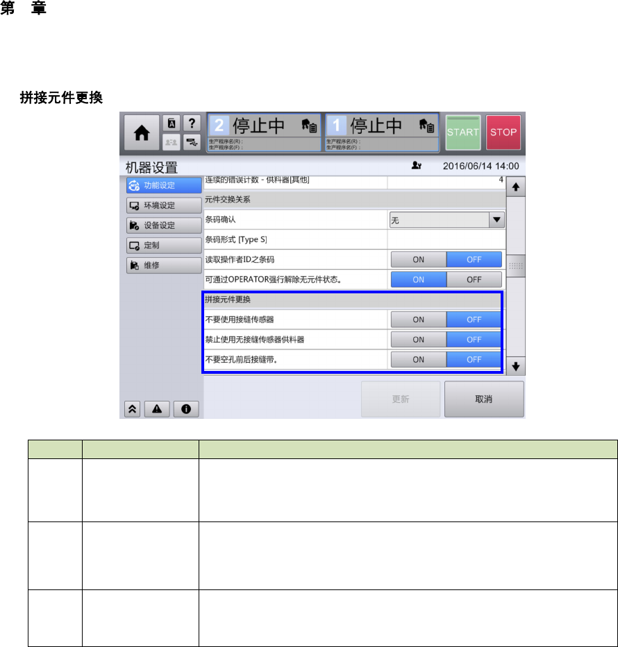 选择功能 ON/OFF,该功能为不能使用没有接缝传感器的供料器。