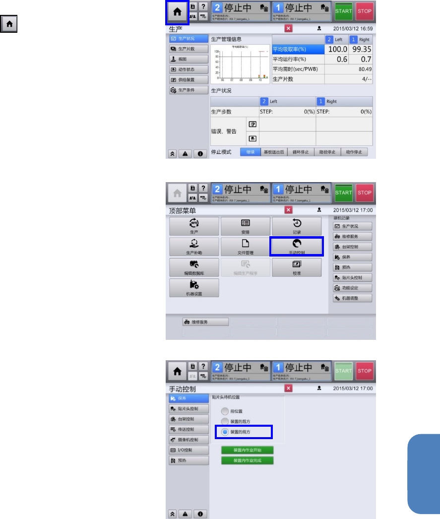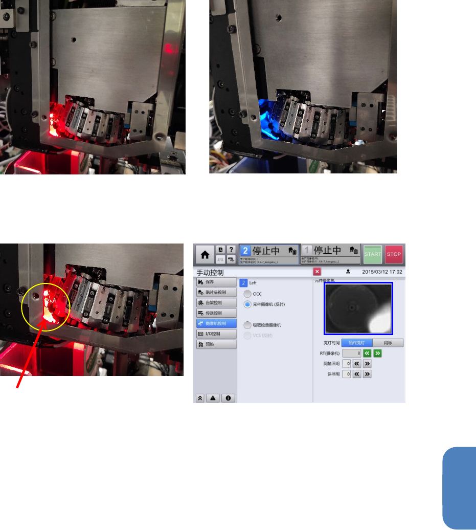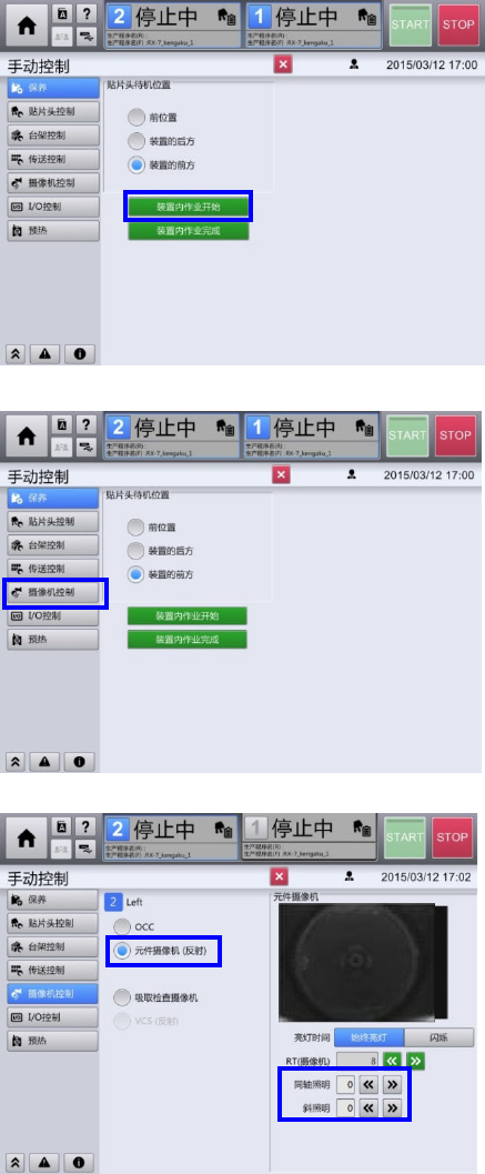 第 5 章 维护篇 5-2. 保养检查 16 1 2 - 4 请按 “ 装置内作业开始 ” 。 台车上升,贴片头向身 前移动。 1 2 - 5 请按 “ 摄像机控制 ” 。 1 2 - 6 切换到右面的画面后, 请选择 “ 元件摄像 机 ” ,将同轴照明及斜照明切 换为 “1” 。 经此操作,元件摄像机 的图像将显示 在 操作画面上,利用点亮 的照明灯可以 容 易地观察画面(反射镜 脏污程度)的 状态。 \ \ \ \