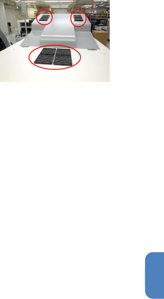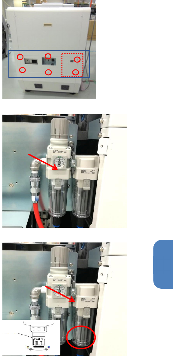 第 5 章 维护篇 5-2. 保养检查 26 补充)调节器与油雾分 离器的配管Φ 10 ,朝背面从右下方伸出。 3 . 空气过滤器的清洁 检查位于台车插入部里 面的吸气风扇 的过滤器。 过滤器有灰尘等堵塞时 ,请用吸尘机 等清除。 4 . 空气过滤器的清洁 检查背面下部盖罩的吸 气风机。(过 滤器 2 个) 过滤器有灰尘等堵塞时 ,请用吸尘器 等清除。