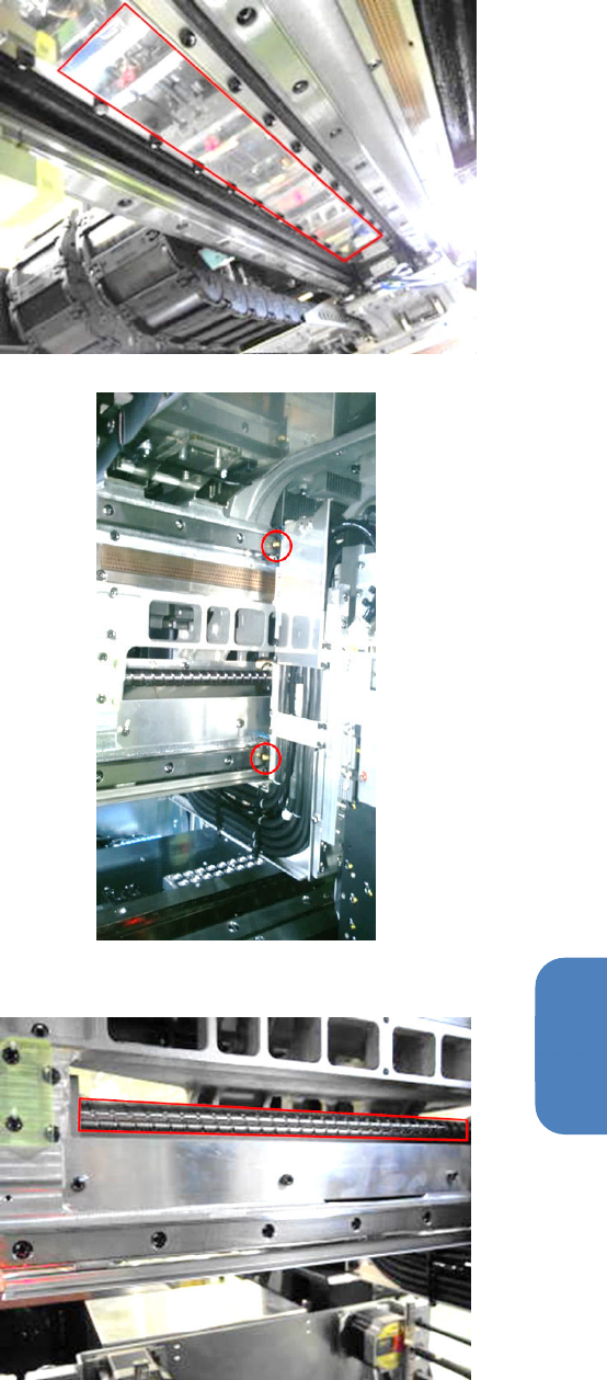 第 5 章 维护篇 5-2. 保养检查 29 5 2 . Y - 线性电动机部的清洁 用清洁的回丝干擦,去 除附着的脏污 。 注意 请不要让磁铁吸附到金 属元件或金属 粉。 3 . X - LM 导轨的清洁及注油 请使用润滑脂枪,通过 导轨滑块的注 油口 适量加注壳牌爱万利 EP 2 润滑脂。 要点: 因为成为油脂下落的原 因 , 所以请擦去 在露出来的油 脂以及 LM 导游固定的螺丝的洞 孔进入的 油脂。 4 . X - 滚珠丝杠的清…