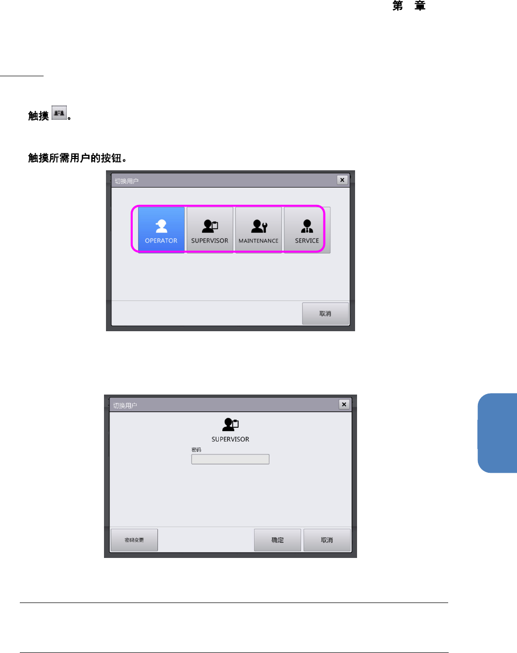 使用软键盘输入密码,触摸[确定]。切换用户完成,返回顶部菜单。软键盘的使用方法,请参见「4-